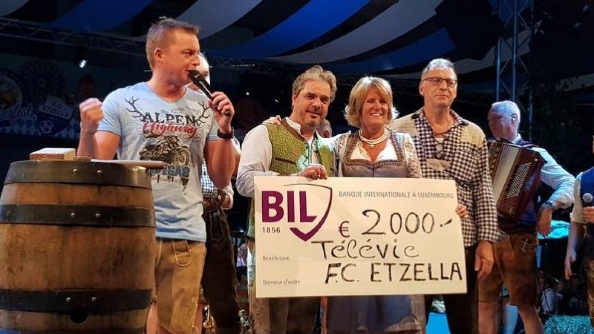 No der Scheckiwwerreechung huet de Buergermeeschter Jean-Paul Schaaf mam President vum Futtball-Club Tun Di Bari taditiounsgemäss d’Faass opgeschloen a mam O’ Zapft is war d’Editioun 2019 lancéiert.