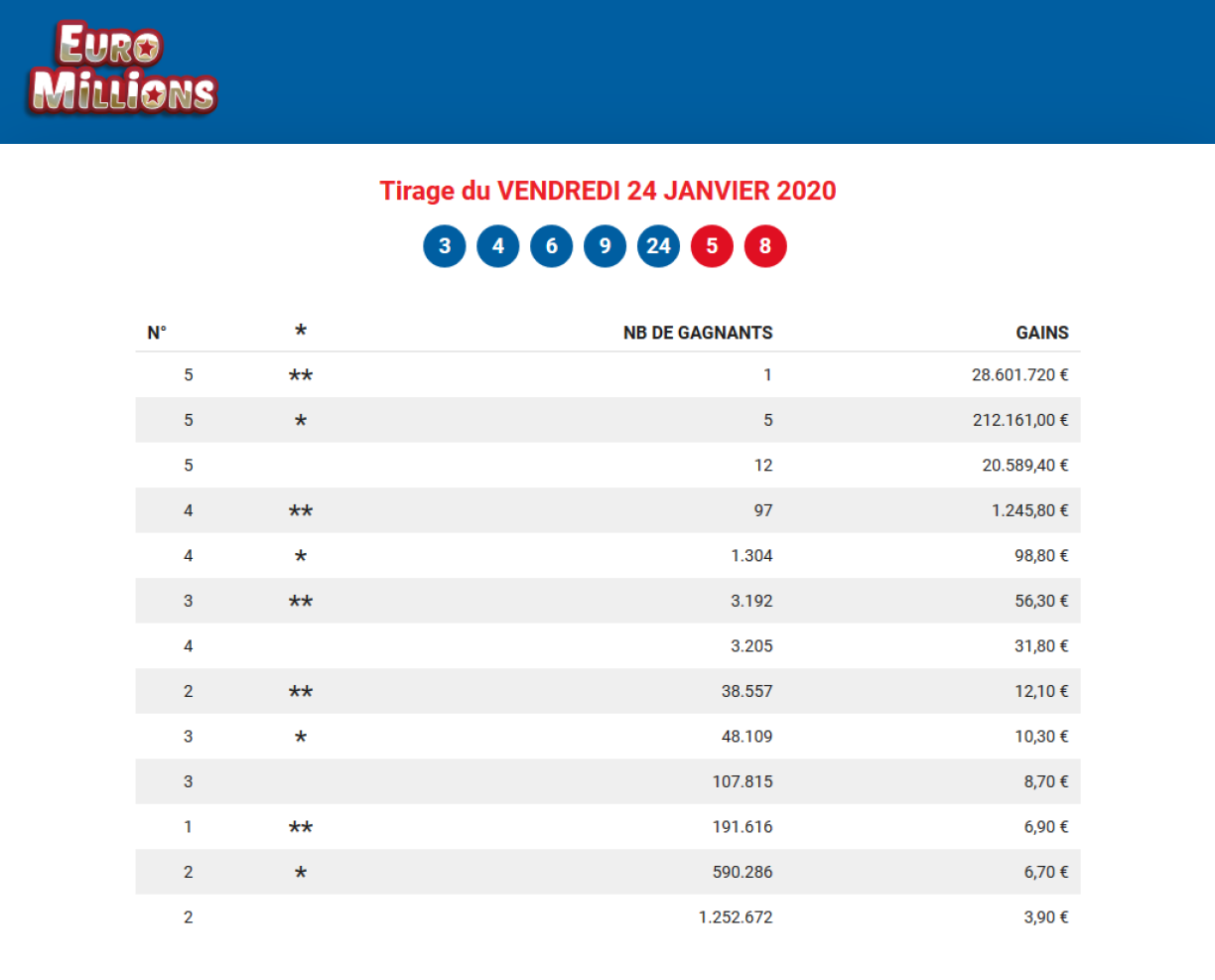 Iwwert eng Zomm vun am Ganzen 28.601.720,00 Euro dierf sech eng Persoun freeën, déi hire Lous zu Lëtzebuerg kaf huet, mat 5 richtegen Zuelen an 2 Stären. Dat steet um offizielle Site vun Euro Millions.