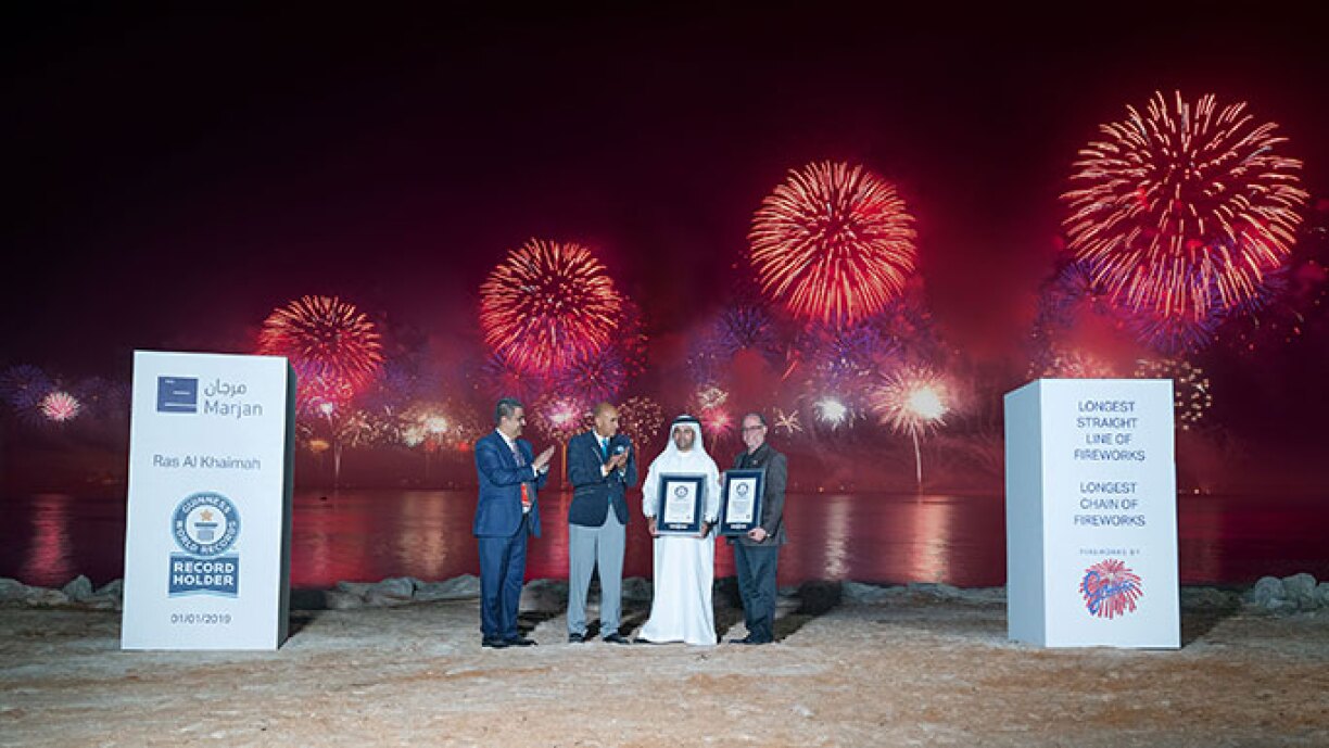 Schonn d’lescht Joer gouf am nërdlechen Emirat Ras-al-Chaima e Rekord verbucht mat engem Feierwierkskierper vun iwwer enger Tonn, dat heescht deem schwéiersten op der Welt.