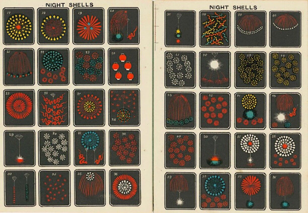 Dem Japaner seng Freedefeier-Designe waren esou exzeptionell, dass se am fréien 19 Joerhonnert op Kaarten opgezeechent goufen an en Numm kruten. Nimm wéi “vertikal Rieder” a “faarweg Blummebommen” weise wéi kreativ den Hirayama war. Sämtlech Kaarte goufen bilingual, op Japanesch an Amerikanesch, katalogiséiert, fir se besser fir d’Nowelt festzehalen.