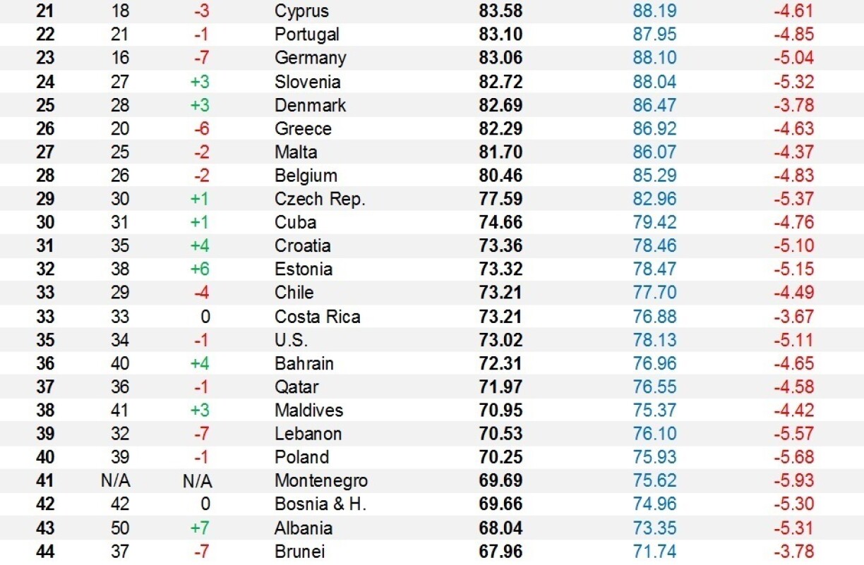 Et ass Norwegen, dat zwou Plazen dobäi gewonnen huet an esou an d’Top 10 geréckelt ass. Lëtzebuerg ass elo op der 11. Plaz. Spuenien konnt mat engem Plus vu 5 Plazen op d'1 sprangen an huet Italien an Island op d’Plazen 2 an 3 verdrängt.