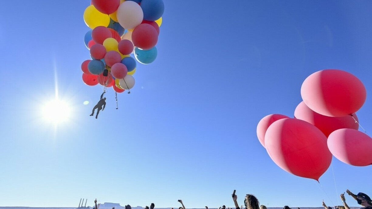 De Video vu sengem Livestream, wéi hie mat de Loftballone flitt, gouf mëttlerweil méi wéi 10 Millioune Mol gekuckt. D’Ballone ware mat Helium gefëllt a wéi hien op enger Héicht vun 7,6 Kilometer ukomm war, huet hie sech vun de Loftballone getrennt an ass mat Hëllef vun engem engem Gleitschierm erëm gelant.