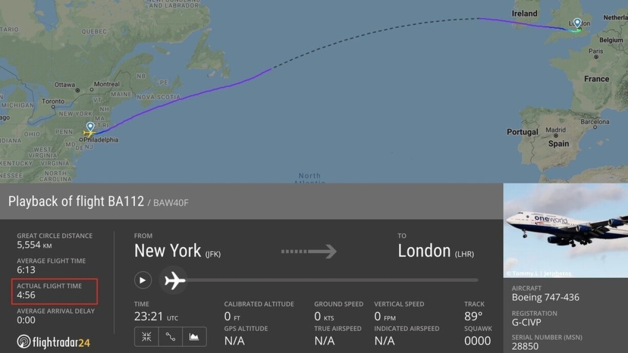 Dëst um Vol e Samschdeg den Owend 23.21 Auer an enger Boeing 747-436. Normalerweis brauch dee Fluch an der Moyenne 6 Stonnen an 13 Minutten. Mä duerch déi gënschteg Loftstréimungen, gouf de Fliger quasi iwwert den Atlantik katapultéiert.
