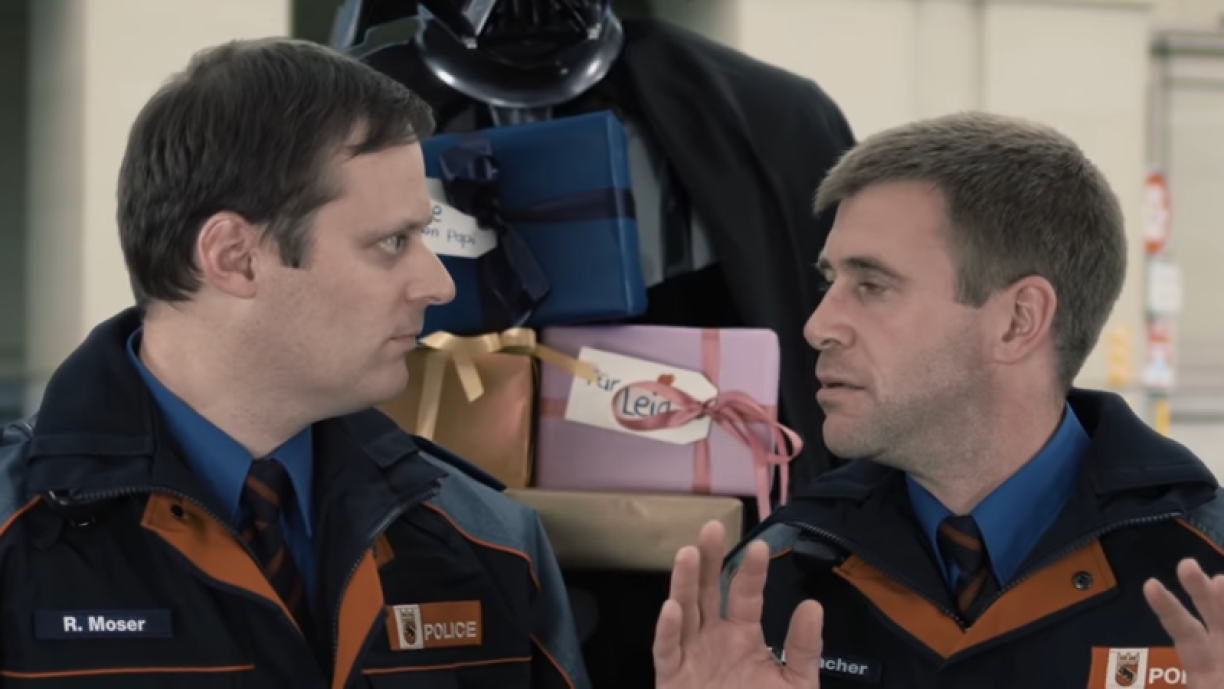 An engem klenge Video um Youtube-Channel vun der Kantonspolizei Bern gesäit een d’Beamte Limacher a Moser am Asaz. Si si grad amgaangen, fir e Protokoll ze verdeelen, wéi si e Shuttel vum Imperium gesinn, wat matten an der Stad gelant ass.