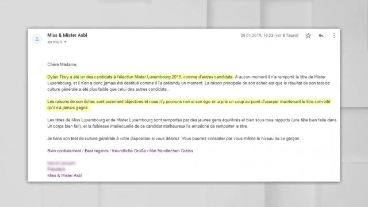 De Comité National vu Miss & Mister Luxembourg huet nom Dylan sengem Post op hirem Site e Statement ginn, fir de richtege Gewënner kloerzestellen. Op seng Virwërf soe si, den Dylan wier e Kandidat ewéi all anere gwiescht an d’Konkurrenz war einfach méi staark.