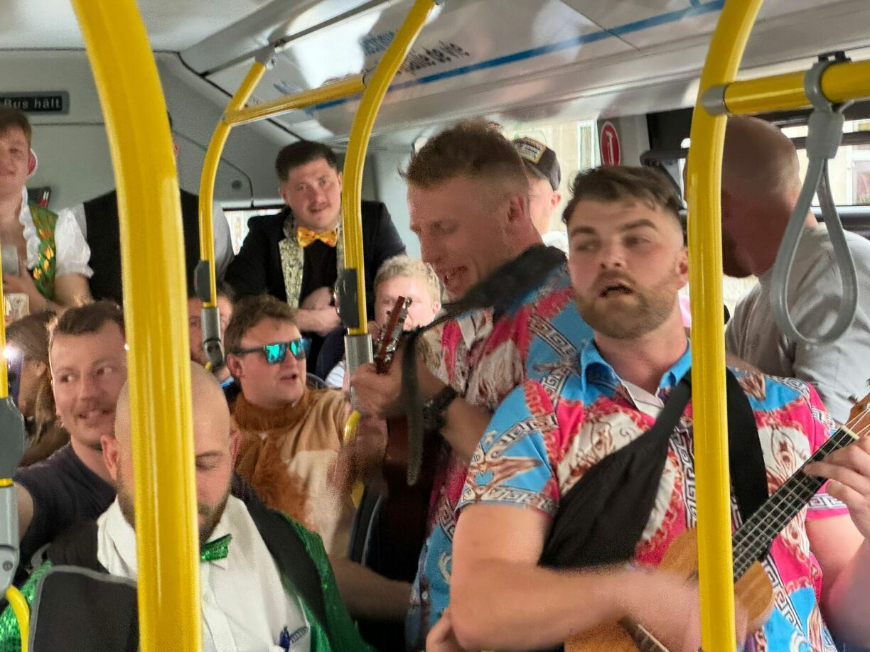 Eng Partie Passagéier, déi e Samschdeg an der Stad an de Bus geklomme sinn, dierften net schlecht gestaunt hunn, wéi eng Rugby-Ekipp aus England mat hirem, et muss een hinne loossen, musikaleschen Talent, d’Stëmmung am Bus ugeheizt huet.