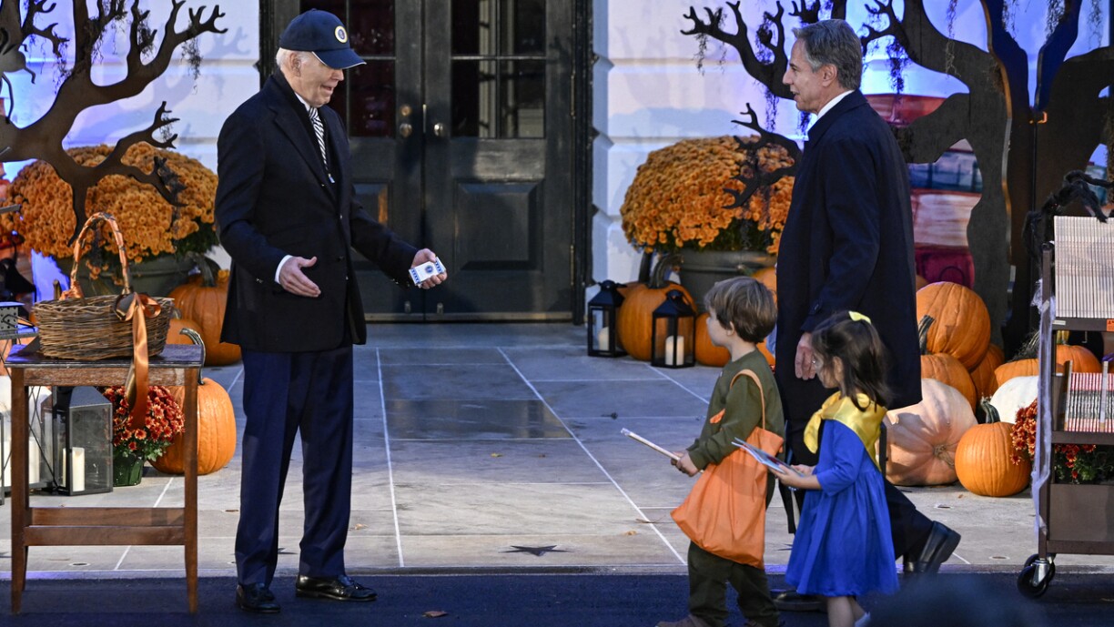 Fir d’Halloween-Party am wäissen Haus huet den US-Ausseminister Antony Blinken säi Bouf als ukrainesche President Wolodymyr Selenskyji verkleet. Dee Klengen hat e grénge Sweatshirt mat engem klengen US-ukrainesche Pins an eng olivegréng Box un.