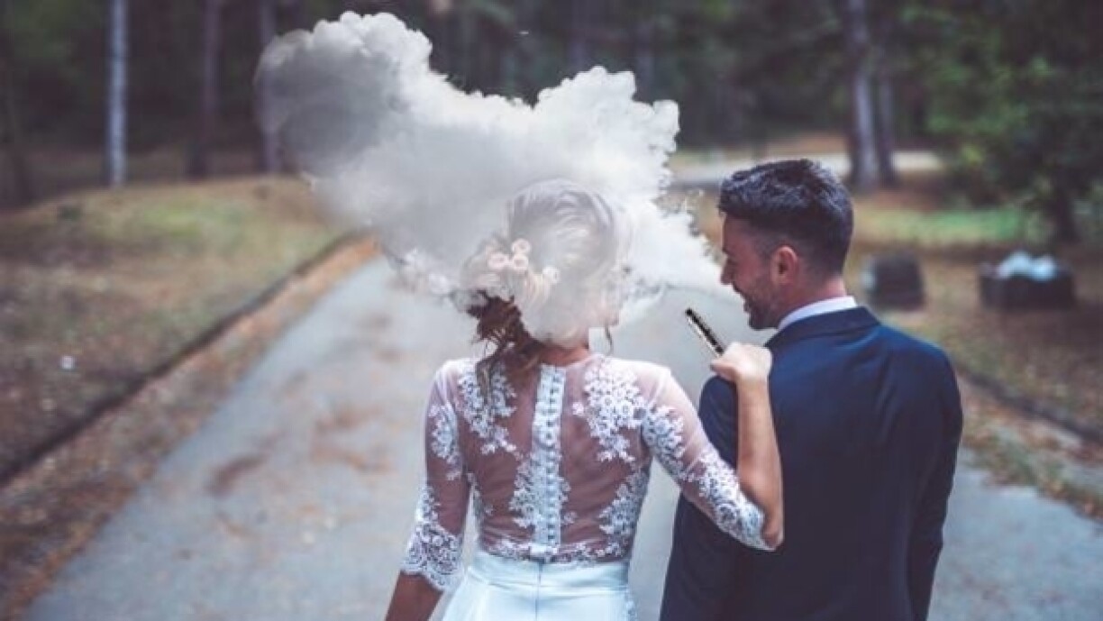 Déi meescht Hochzäitsfotoe sinn dezent, weisen eng verléifte Koppel, vläicht mat engem spektakulären Hannergrond oder an engem besonnesch romantesche Moment, ma wann d’Koppel an engem wäissen Damp verschwënnt, läit dat wuel un engem neien Trend: dem sougenannte Vaping.