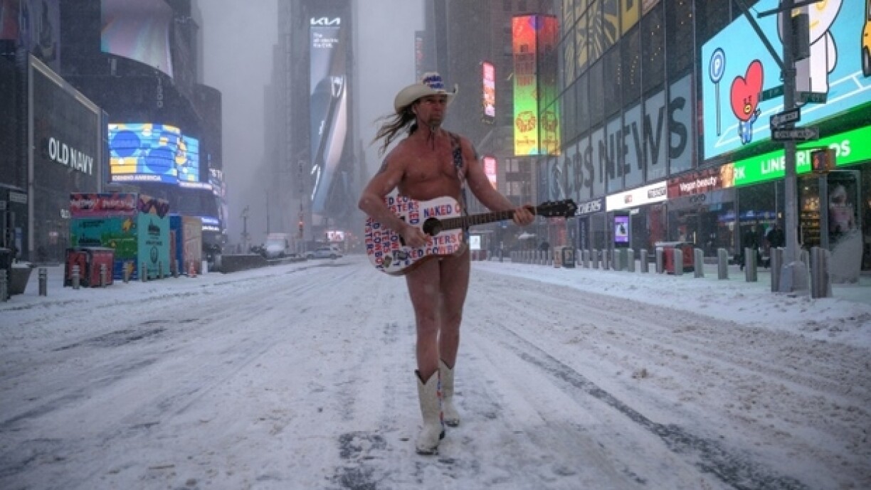 Dorunner huet sech awer wéi et schéngt net jidderee gehalen. Trotz de ville Warnungen huet de berüümten “Naked Cowboy” Robert Burck um Times Square säi Stroosseconcert, deen hie reegelméisseg mécht, ofgehalen. Natierlech, wéi soll et anescht sinn, just a senger Ënnerwäsch, dem Cowboy-Hutt an de Cowboy-Stiwwelen. Ob vill Leit de Concert gekuckt a laang nogelauschtert hunn, ass net iwwerliwwert.