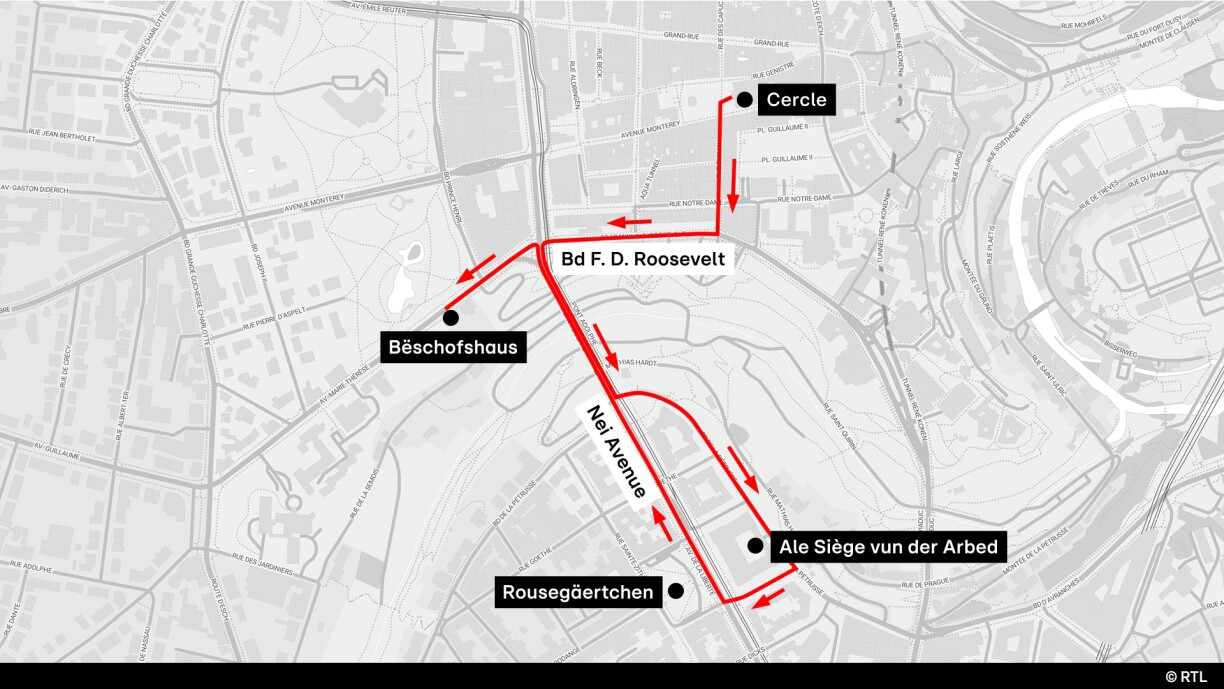 De Parcours geet virum Cercle op der Place d’Armes lass, ier de Poopst dann duerch d’Rue Chimay (Dräikinneksgaass) an de Bouvevard F.D. Roosevelt laanscht d’Gëlle Fra bis iwwert déi Nei Bréck a Richtung Garer Quartier fiert. Op der Gare geet et dann iwwert de Boulevard de la Pétrusse, duerch d’Rue Heinrich Heine vis-à-vis vum Rousegäertchen an dann duerch d’Avenue de la Liberté nees zeréck op de Pont Adolphe.