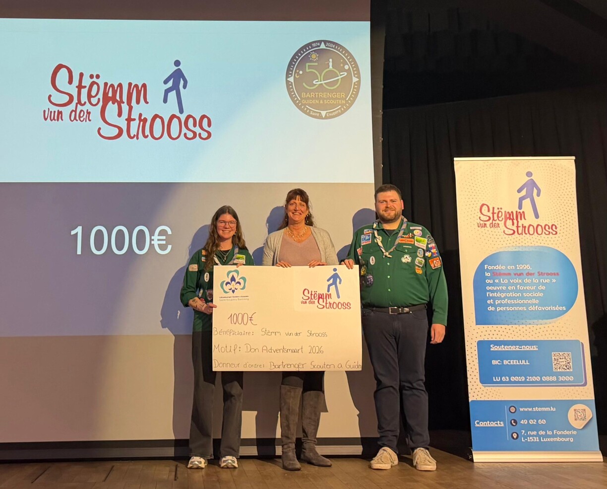 Les Bartrenger Guiden a Scouten ont remis un don de 1.000 euros à la Stëmm vun der Strooss, issu des recettes de leur traditionnel marché de l’Avent.