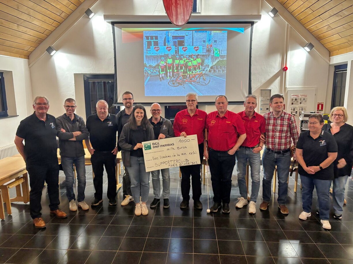 Zum Ofschloss vun der Generalversammlung gouf och dëst Joer erëm eng solidarësch Aktioun ëmgesat: De Supporterclub huet e Scheck vun 1.000 Euro un d’Associtioun Les Tandems de la Vue iwwerreecht. Dës engagéiert Asbl organiséiert Vëlostouren a fiert mat Tandemen zesumme mat Leit, déi net méi gesinn oder eng Séibehënnerung hunn, a mécht esou de Cyclissem fir jiddereen zougänglech.