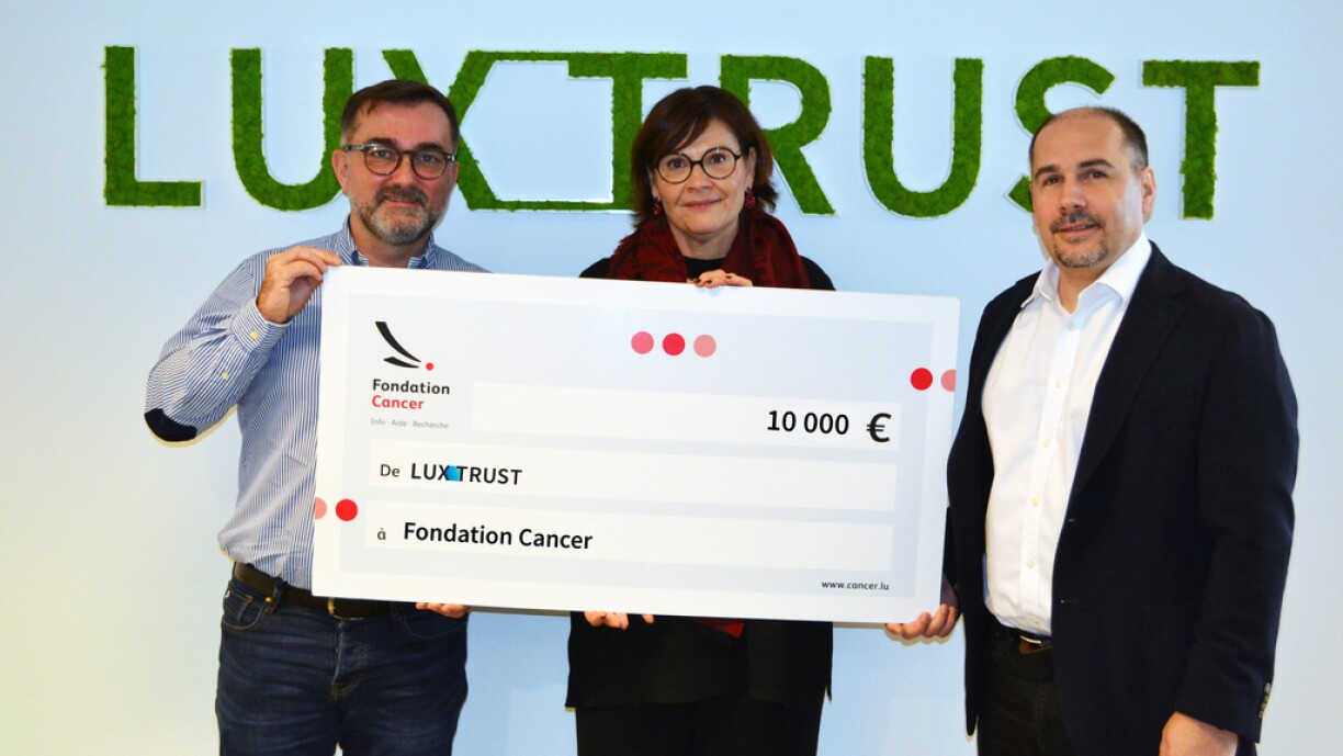 « LuxTrust S.A. huet sech dozou decidéiert den Engagement vun der Fondation Cancer ze ënnerstëtzen. Duerch dës Solidaritéitsaktioune konnt LuxTrust eng generéis Zomm vu 5.000 € sammelen, déi vun hirem Exekutivcomité op 10.000 € verduebelt ginn ass.