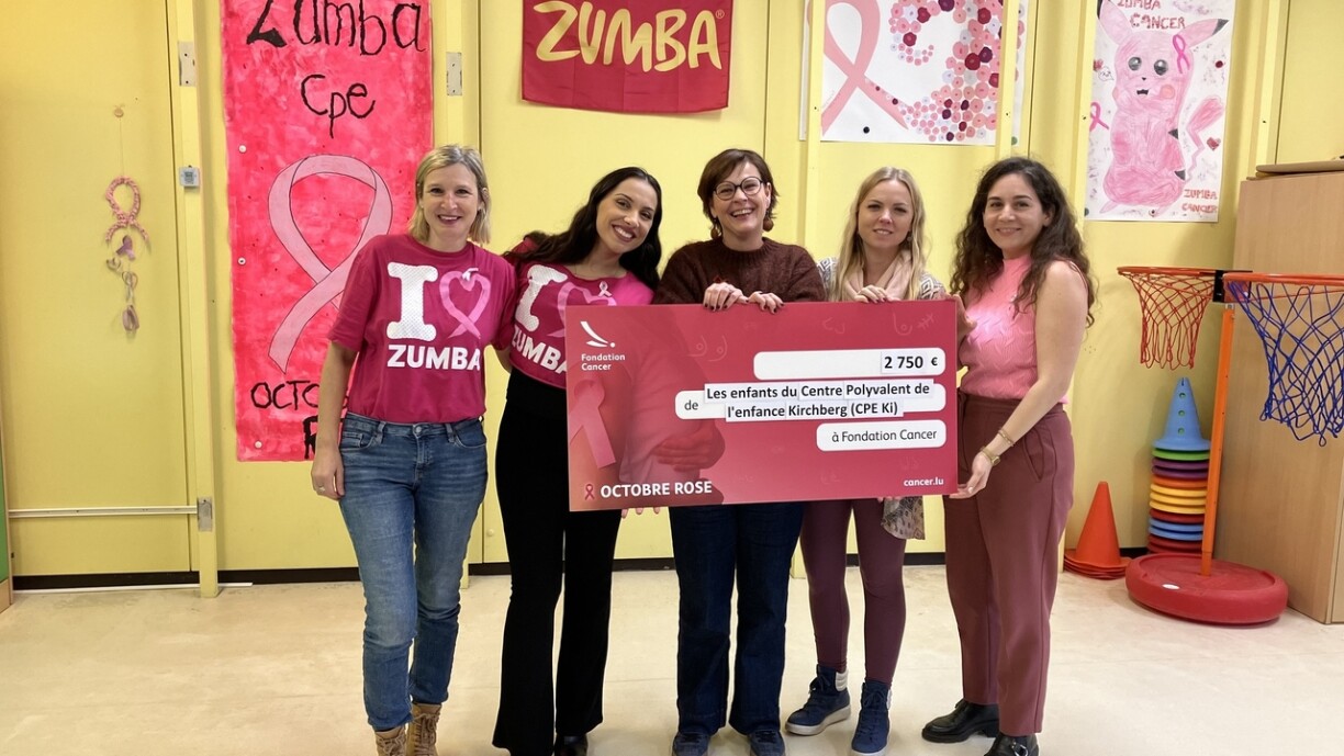 Am Kader vum internationale Broschtkriibsmount Rosa Oktober hunn d’Kanner vum Centre Polyvalent de l’Enfance Kirchberg, an Zesummenaarbecht mat hiren Elteren an den Educateur’en, sech dozou decidéiert den Engagement vun der Fondation Cancer ze ënnerstëtzen andeems si eng flott Zumba Party op d’Bee gestallt hunn.