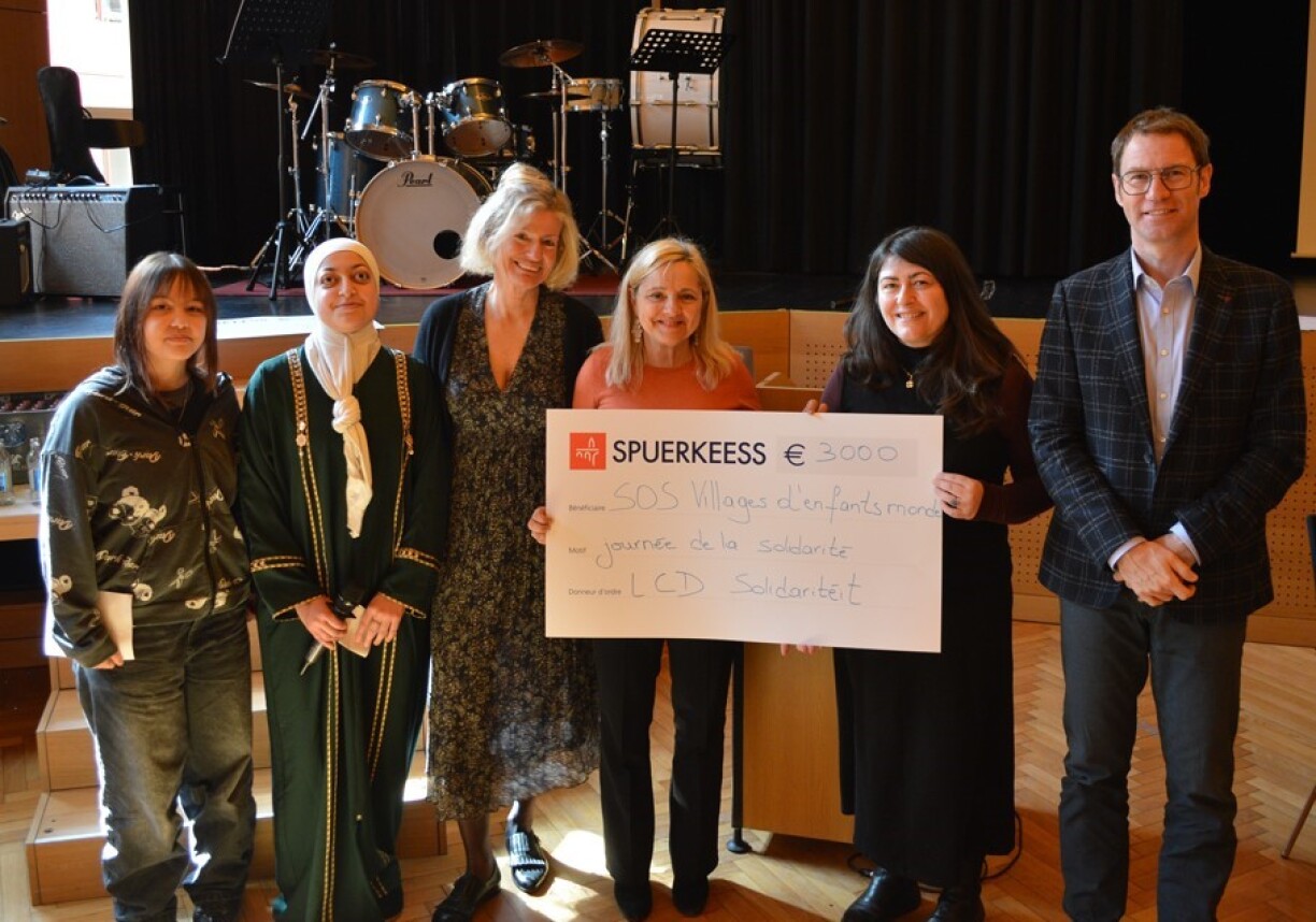 Ënnert de fënnef Associatiounen, déi op der Journée de la solidarité am Dikrecher Lycée an d'5e-Klasse gaange sinn, war och eng Ekipp vun SOS Villages d’Enfants Monde. Dobäi krute si e Scheck vun 3.000 Euro iwwerreecht.