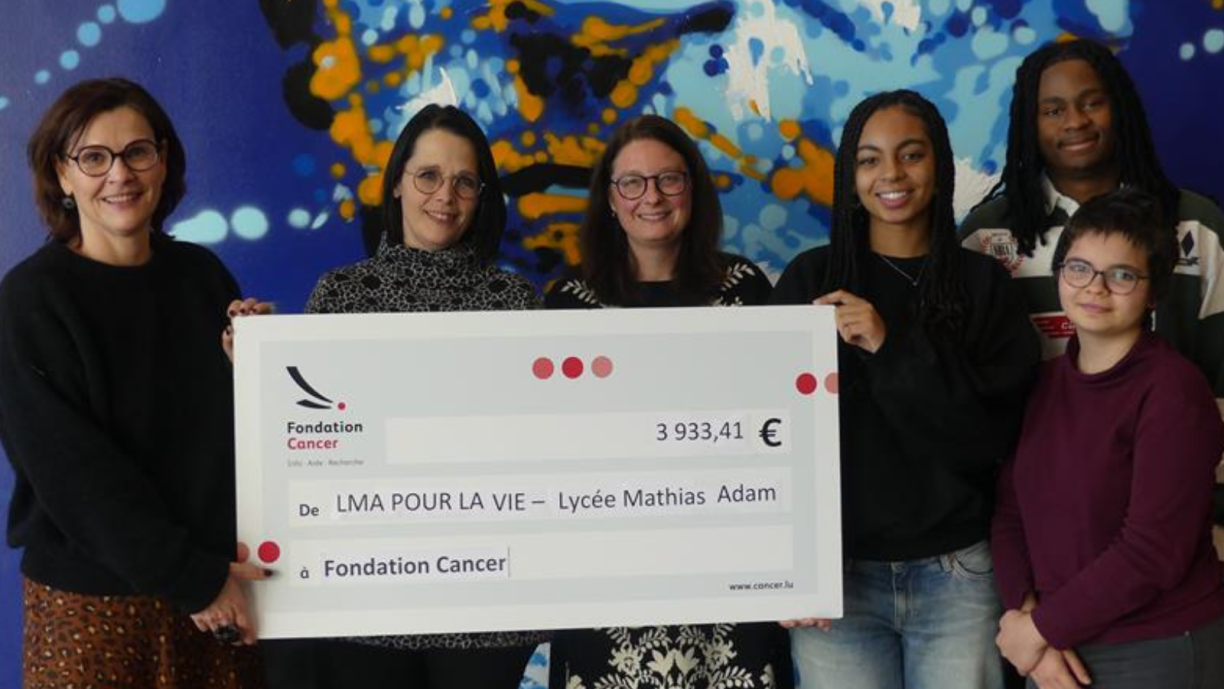 Duerch dës dynamesch a solidaresch Aktioun ass eng Zomm vun 3.933,41 € zesummekomm, déi de Lycée Mathias Adam integral un d’Fondation Cancer iwwerreecht huet.