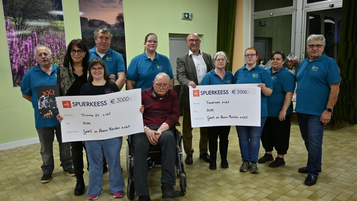 Zesumme mam Virstand huet de President zwee Schecken iwwerreecht, déi duerch de Verkaf vun Eisekuchen iwwert dat ganzt Joer zestane komm sinn. Deen éischte Scheck an Héicht vun 3.000 Euro huet d’Presidentin Martine Eischen vun “Trisomie 21" entgéintgeholl. Déi selwecht Zomm ass un d’Vereenegung “Trauerwee” gaangen, déi de Sekretär Max Zuccoli op der Bün ugeholl huet. Béid Organisatiounen hunn doropshin erkläert, wou d’Suen an Zukunft genee agesat géife ginn.
