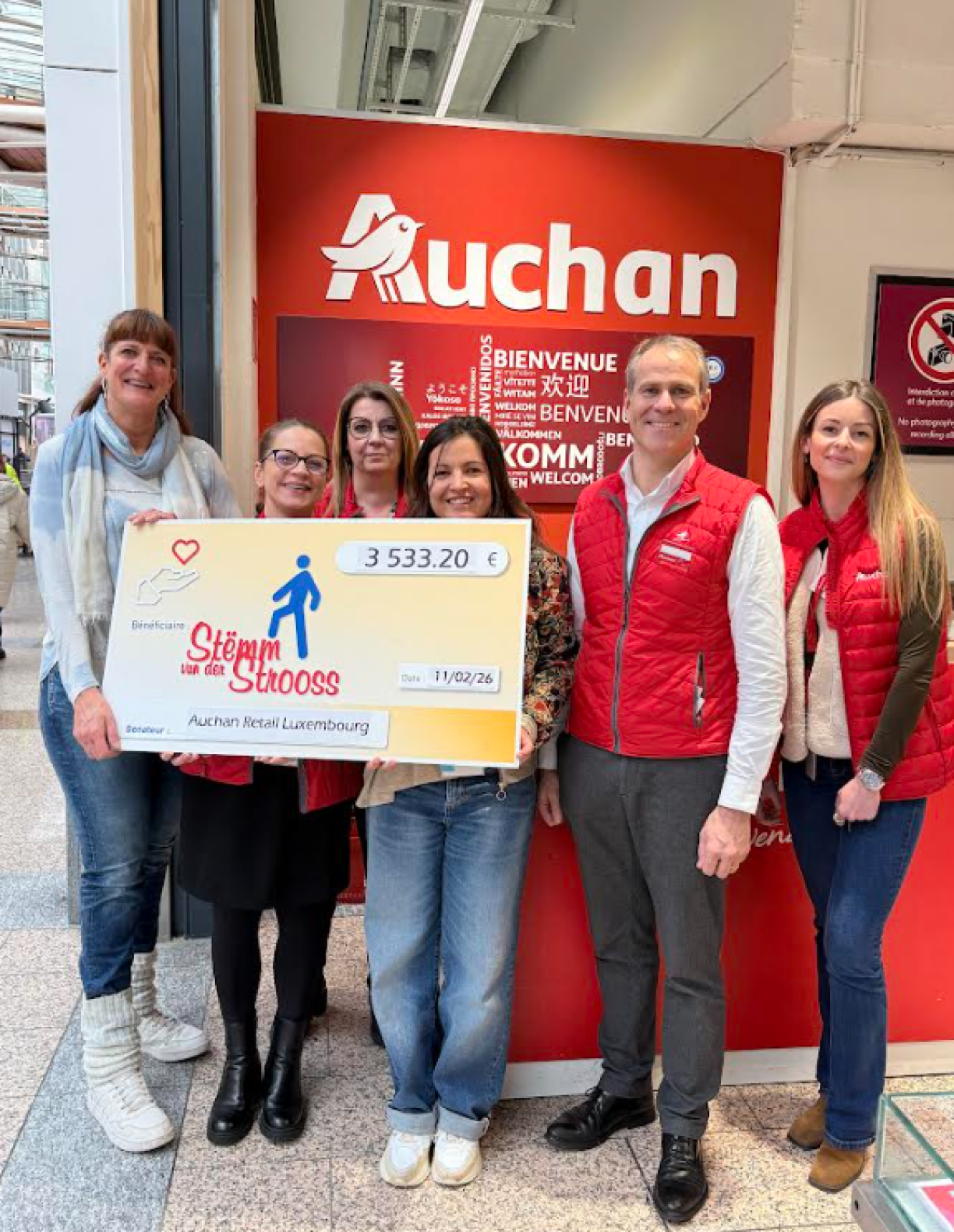 Am 11. Februar fand bei Auchan Kirchberg die offizielle Übergabe einer Spende in Höhe von 3.533,20 € an die Stëmm vun der Strooss statt.