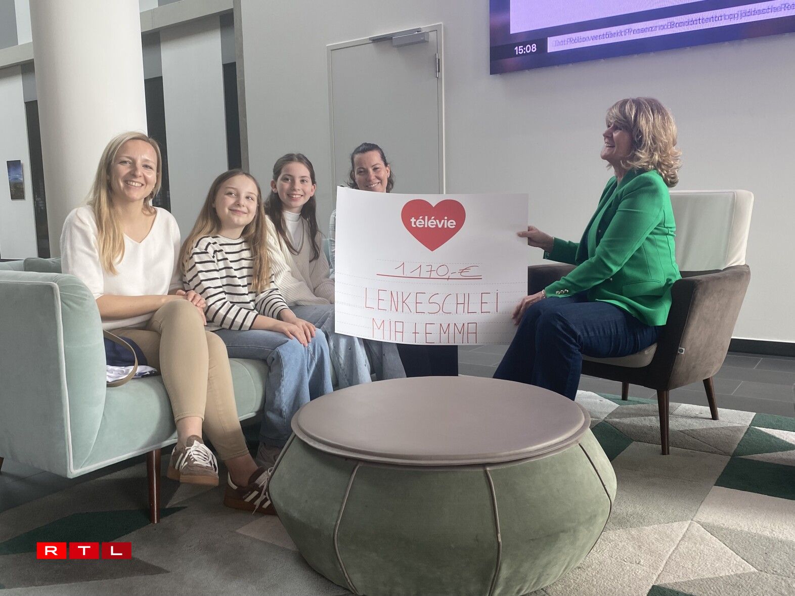 En Dënschdeg, de 24. Mäerz waren d’Mia Kerekes an d’Emma Weynandt zesumme mat hire Mammen an d’RTL City komm, fir dem Diane Wunsch hire Scheck vun 1.170 Euro ofzeginn.