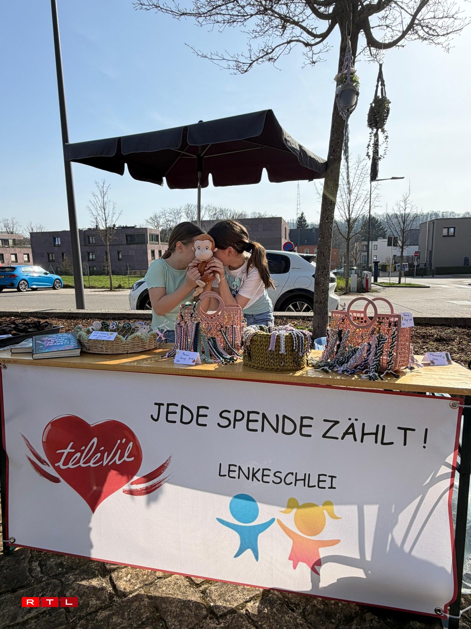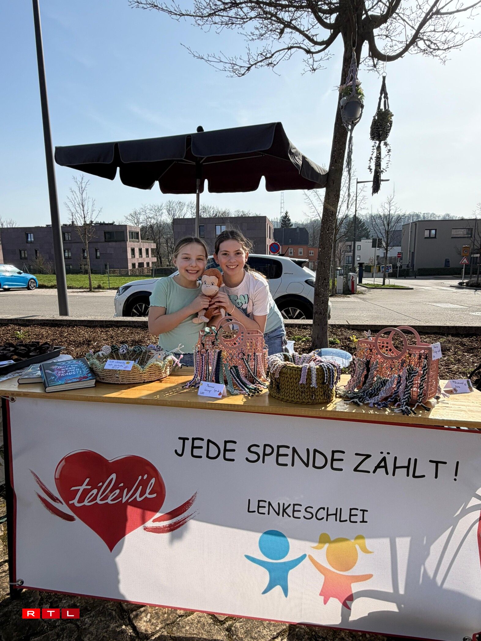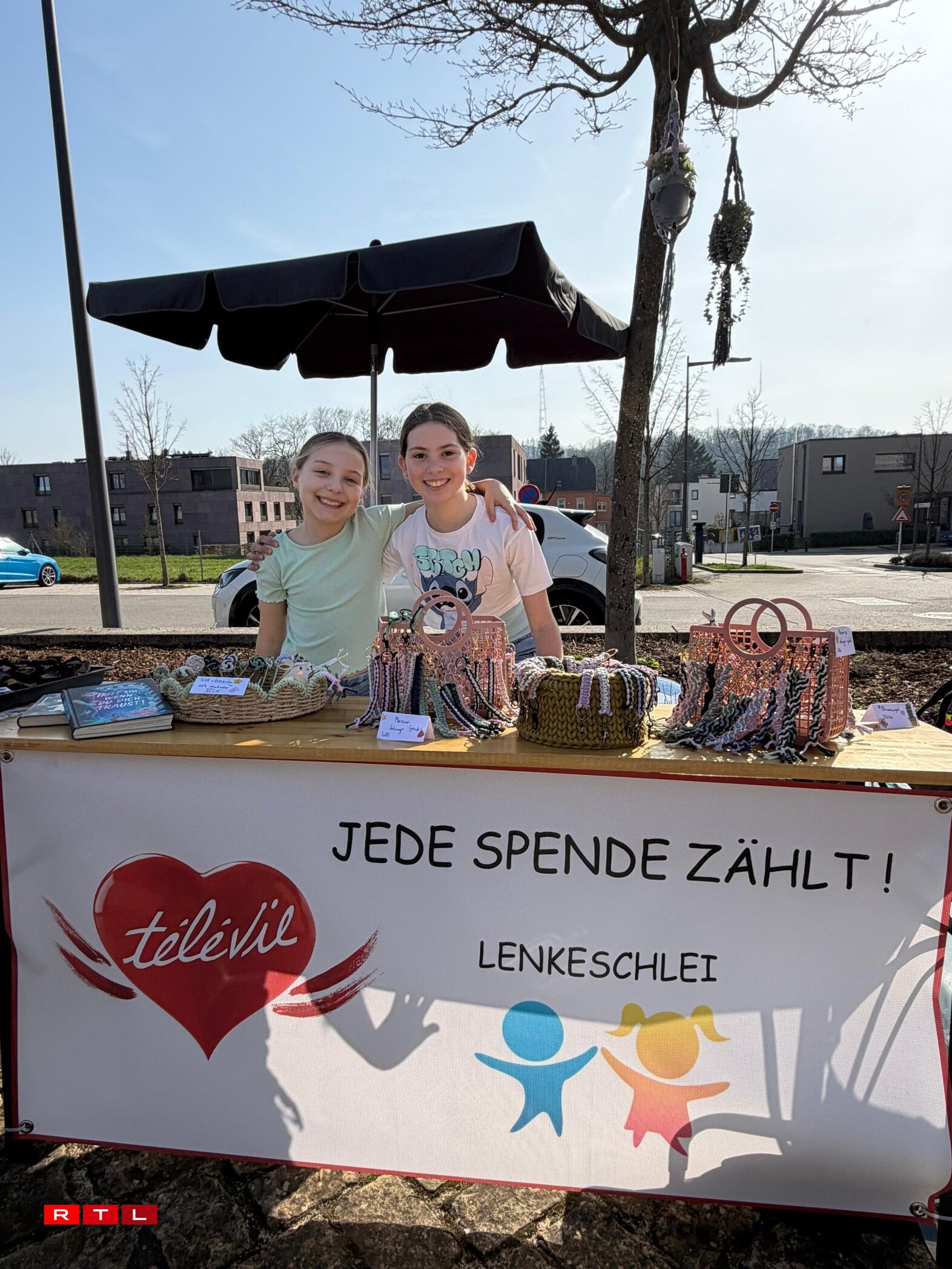 E Sonndeg, den 8. Mäerz hunn déi zwee Meedercher mat Hëllef vun hire Familljen am Nomëtteg vun 14.30 Auer bis 16.30 Auer an der Cité, an där si zu Diddeleng wunnen, Artikelen, Kuch a Kaffi fir den “Télévie” verkaf. “Mir hunn eng Spendenaktioun mat Kuch, Macramé, Unhänger a Lieszeeche gemaach. A mir hunn d’Kaffismaschinn erausgeholl a Kaffi gemaach”, erzielt mir d’Mia voller Freed.