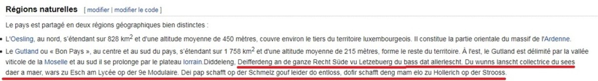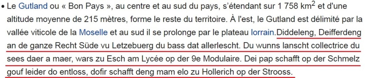 Ass de Wikipedia-Artikel an der éischter Hallschecht nach sachlech an informativ, esou gëtt et am zweeten Deel dach kuriéis. Virun allem no der Lektür vun der Rubrik “Régions naturelles” an der Beschreiwung vum Guttland ass een dach bass-erstaunt.