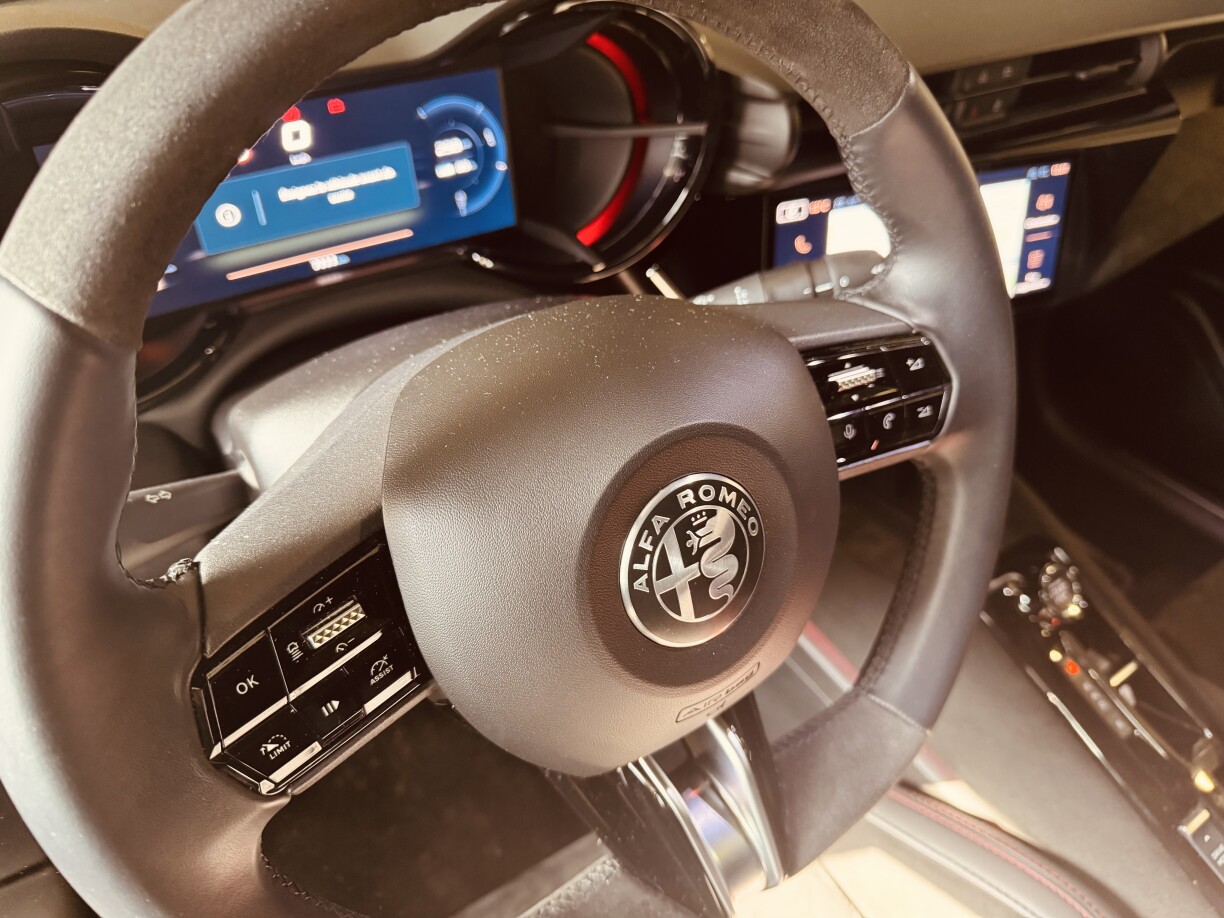 Do huet den Alfa Romeo Junior Veloce 3 Gesiichter: Wann‘s de am Eco-Modus ënnerwee bass, dann ass et éischter eng lam Innt. Am normale Modus eng Int an am Sport-Modus eng wëll Int. Et ass ganz kloer, datt den Auto am Sport-Modus am meeschte Spaass mécht. Hei kennt seng direkt Lenkung perfekt zum Asaz an och seng haart Fiederung, gëtt dem Chauffeur ee gudde Feedback.