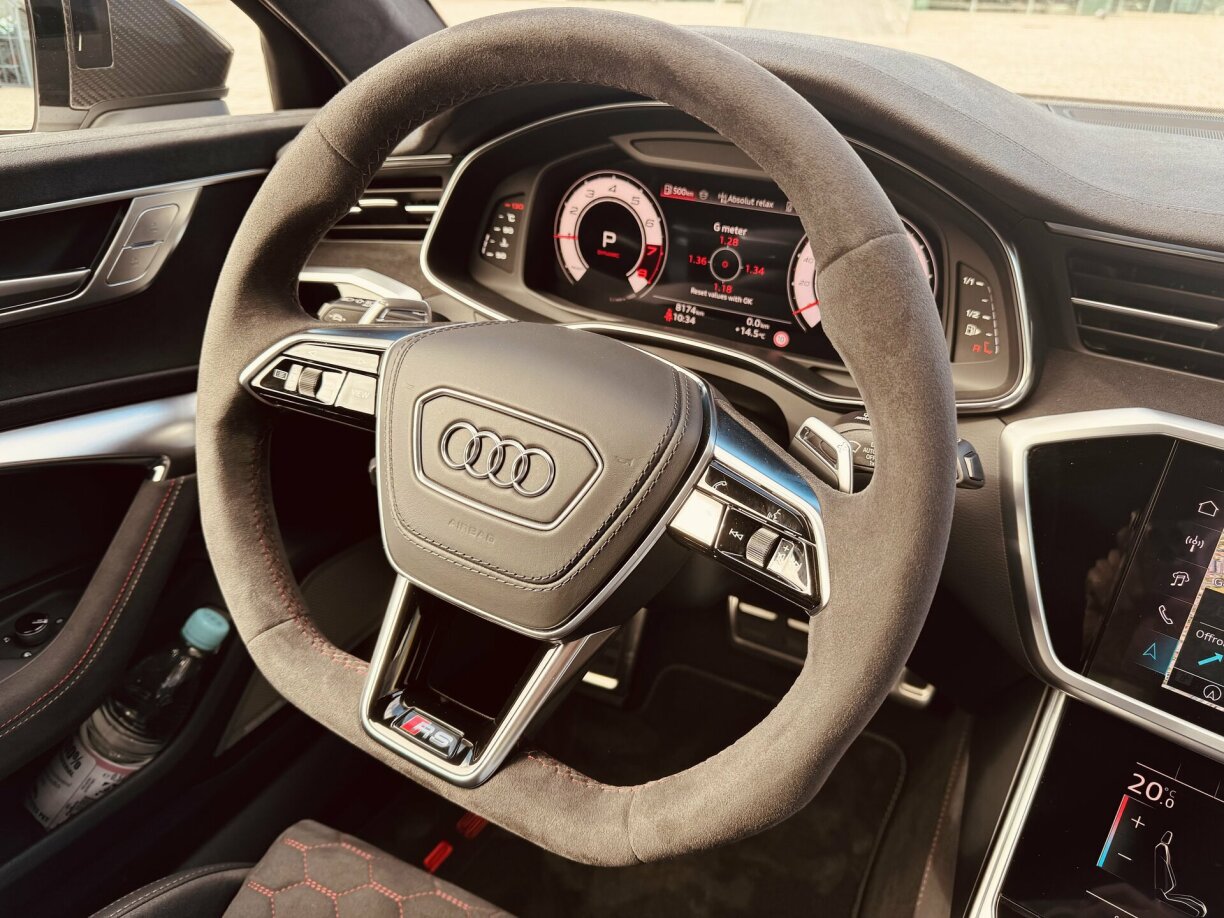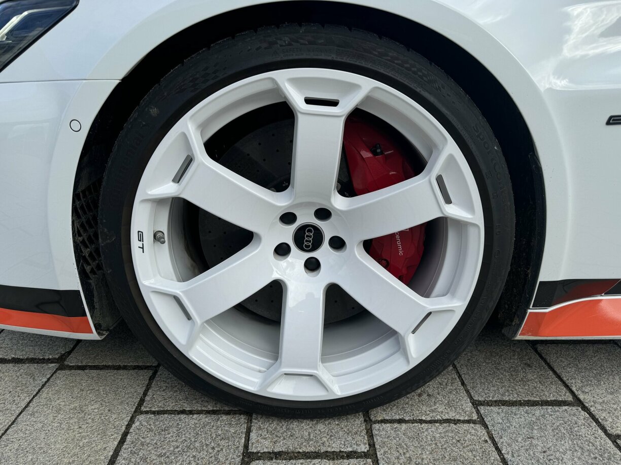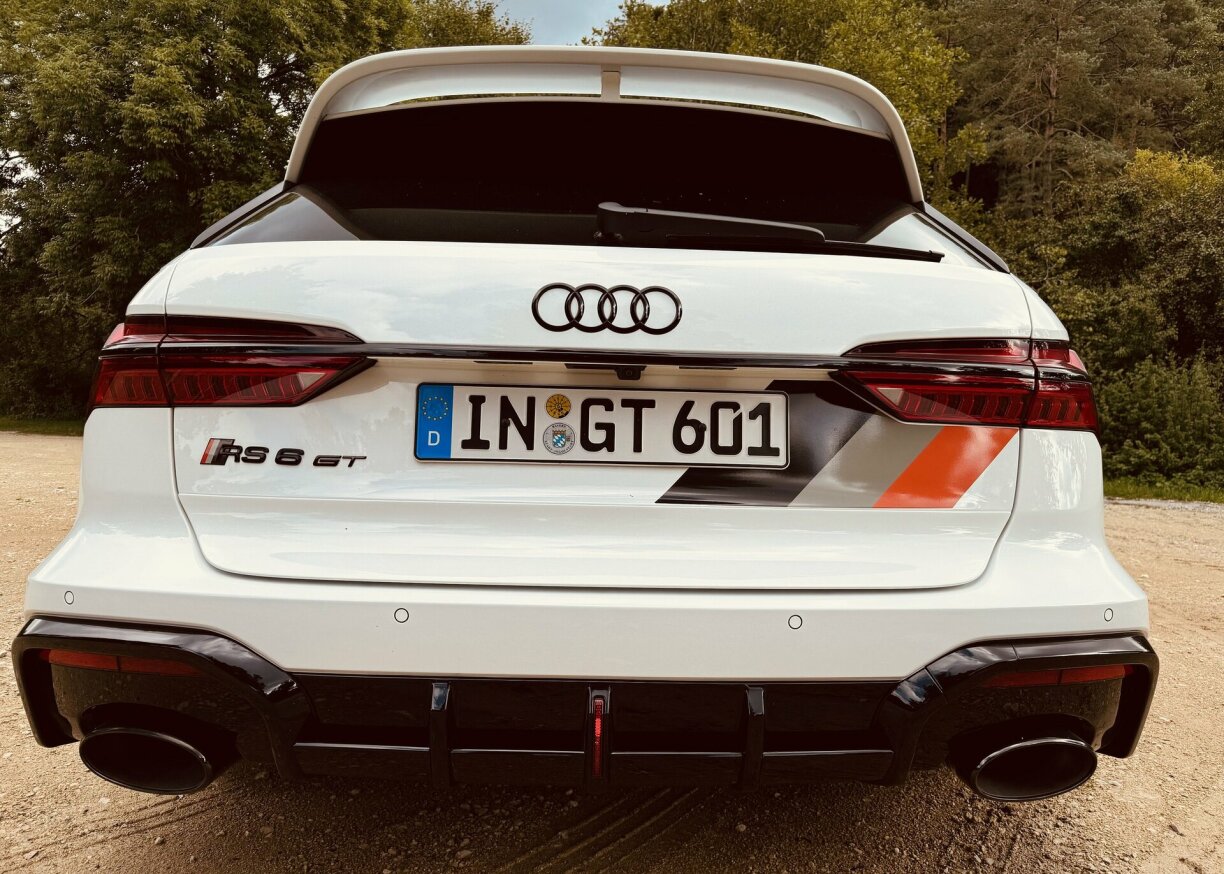 D’Zuele schwätze beim Audi RS6 GT fir sech: 4 Liter Bi Turbo, 8 Zylinder, 630 Päerd a vun 0 op 100 an 3,3 Sekonnen. Dat ass, fir et bescheiden auszedrécken, sportlech. Apropos bescheiden. Wann ee mam RS6 GT ënnerwee ass, dat fält een op. Eleng schonns duerch de Klang zitt een d’Blécker op sech. Awer och duerch säin imposant Wierken. Opfälleg dobäi ass den imposanten Külergrill, déi 22 Zoll wäiss gesprëtzte Felgen, d’Autocollanten, déi op déi wäiss Karosserie gepecht goufen. Dat alles erënnert un de legendären Audi 90 GTO, dee viru ronn 30 Joer op de Circuiten doheem war.