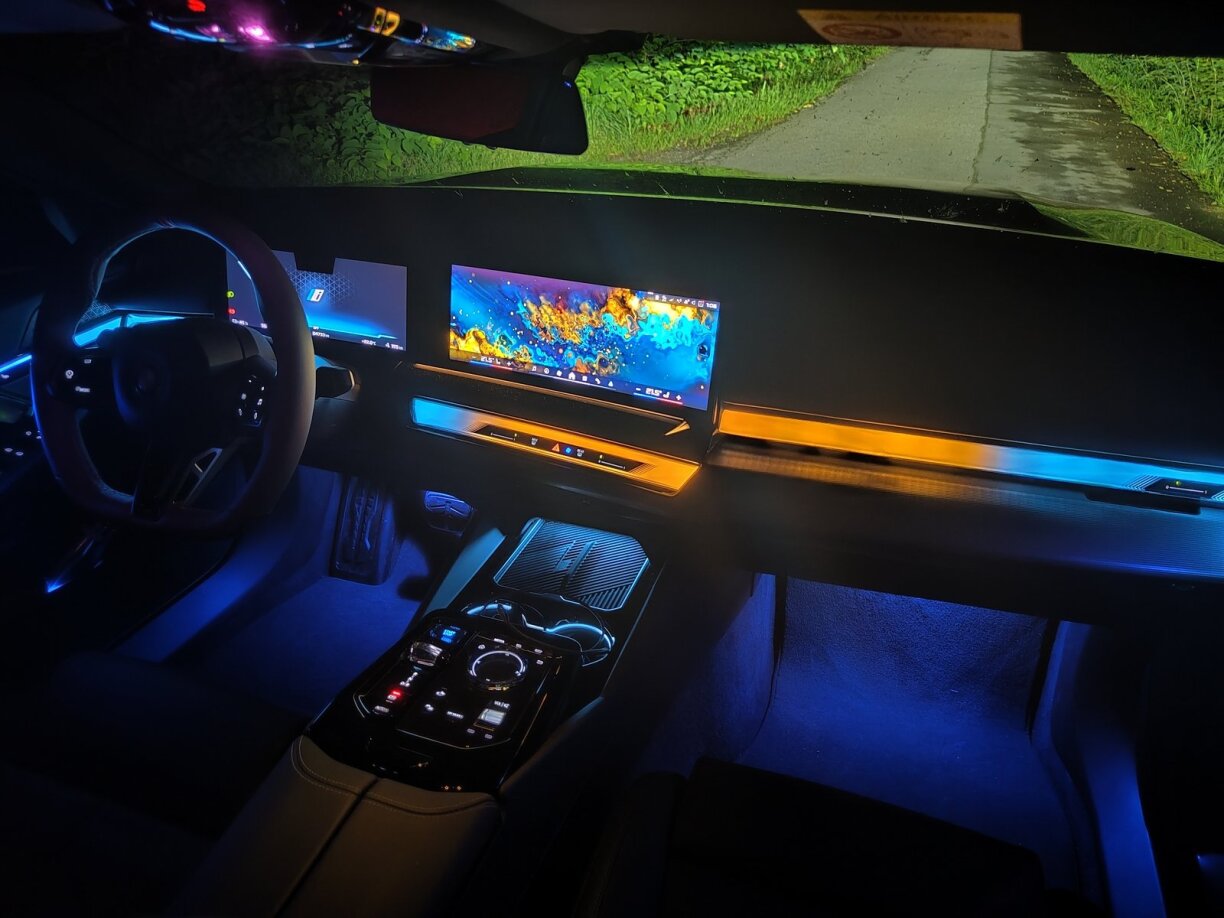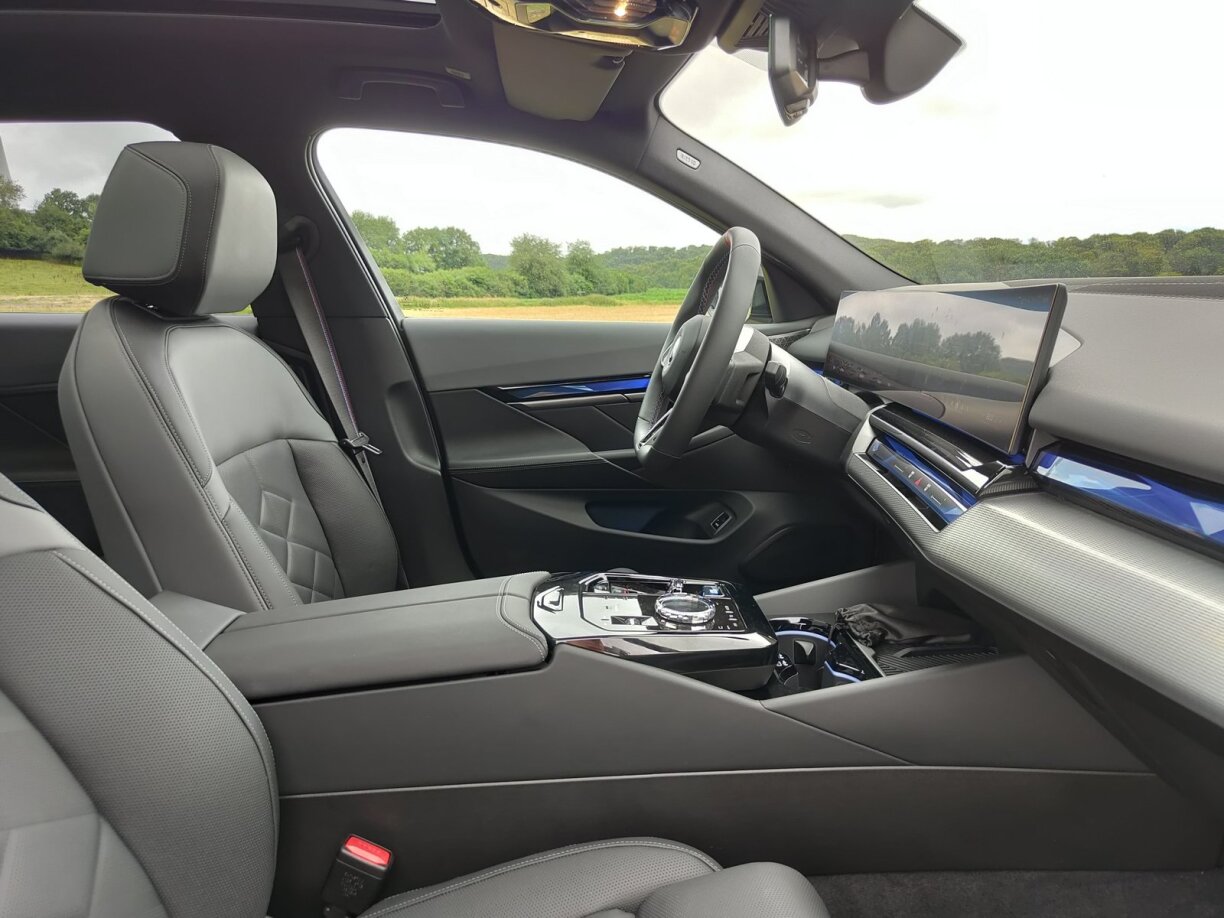 Dat kann een esou soen. Knapp 2.000 Kilometer hat ech mam Elektro-Kombi gemaach. Engersäits fir seng Laangstreckequalitéiten an awer och den Alldag mam Elektroundriff ze testen. Als flott Kiischt um Kuch war et och nach d’Topversioun M60 mat 601 PS. Mee fir d’éischt emol bei d’Basics; de Sëtzconfort ass hanne wéi vir typesch BMW: e passt wéi de Costume op d’Mooss, dozou dee relativ soberen Design vum Tableau, déi nei a flott gemaachten Dekorbaguette mat integréierter Ambiancebeliichtung an déi allgemeng extrem niddereg Fuergeräischer.