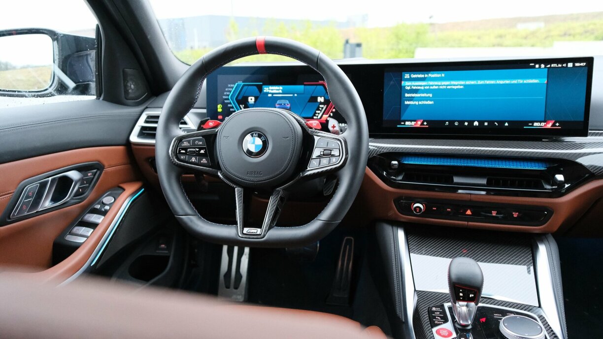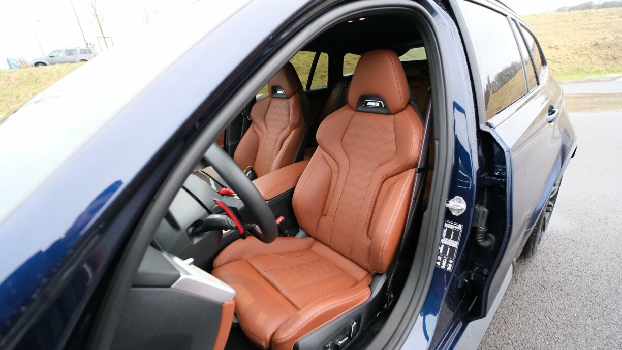 Éier mer bei d’Fuere kommen, wollt ech BMW nach merci soen, fir d’Konfiguratioun, déi se dem Presseauto ginn hunn. E wonnerschéint däischterblot Baussekleed (Tansanitblau II) a bannen eng Kombi aus enger Zort Cognac-faarwegem Lieder (Tartufo) mat enger ganzer Partie Carbon. Dat hätt ech esou ni am Konfigurator zesummegestallt, ma et huet richteg eedel ausgesinn.