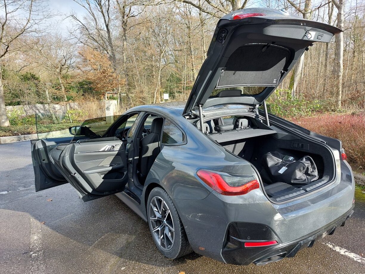 De 4direge Coupé ass fir Passagéier iwwer 1m70 näischt méi. Fir d’Knéien hannen nach ok, mee de Kapp schautert dann um Daach Himmel. Mee fir d’Famill mat Kanner misst dat klappen. Zemools an d’Mall elo, jee no Konstellatioun, tëscht 470 a bal 1300 Liter erapassen. Hei mierkt een dass den neie 4er Gran Coupé 14 Zentimeter méi laang ginn ass.