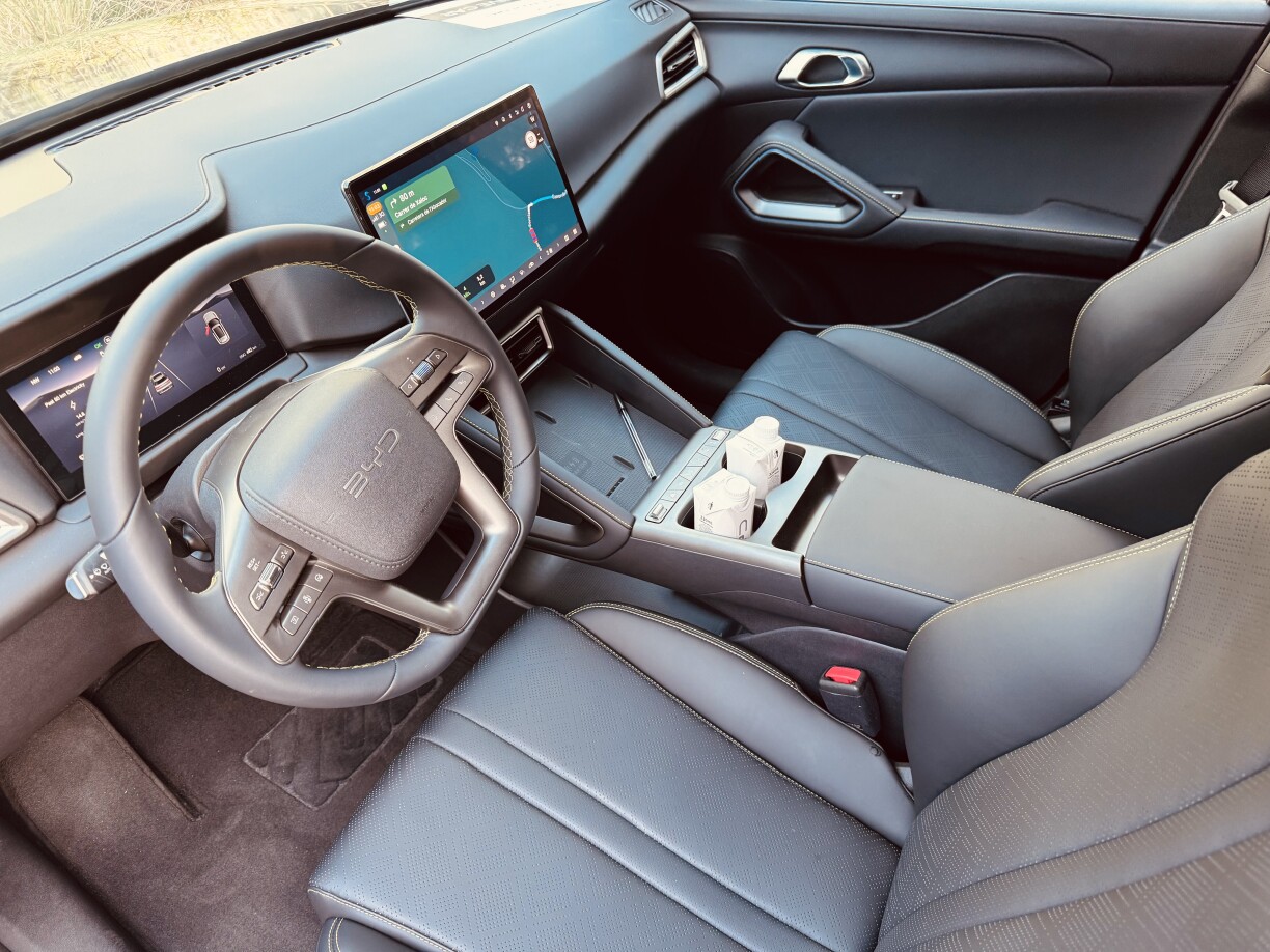 Hei kann ech mech net ze wäit aus der Fënster leeën, well Testkilometer leider ze kuerz waren, fir ee reelle Wäert kënnen ze nennen. BYD versprécht awer, 930 Kilometer fir d‘Active Versioun, mat 166 Päerd déi engem zu Verfügung stinn. Reng elektresch soll ee 40 Kilometer kënne fueren. Bei der Boost Versioun, déi 212 Päerd liwwert, soll een déi magesch 1.000 Kilometer kënne knacken an 90 Kilometer mam Akku kënne fueren. Mäi Verbrauch louch bei deene gutt 30 Kilometer, déi ech gefuer sinn, bei 4,6 Liter.