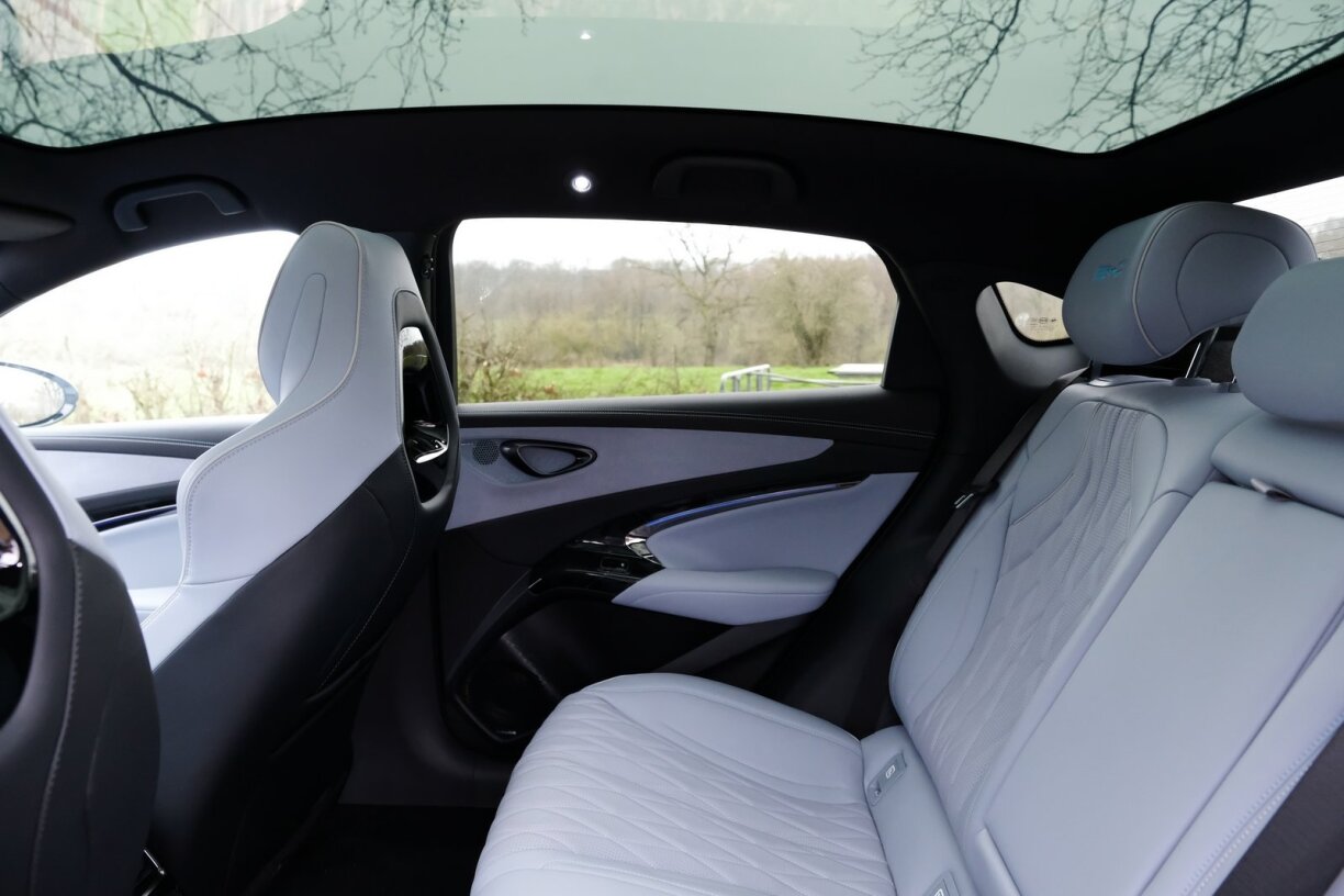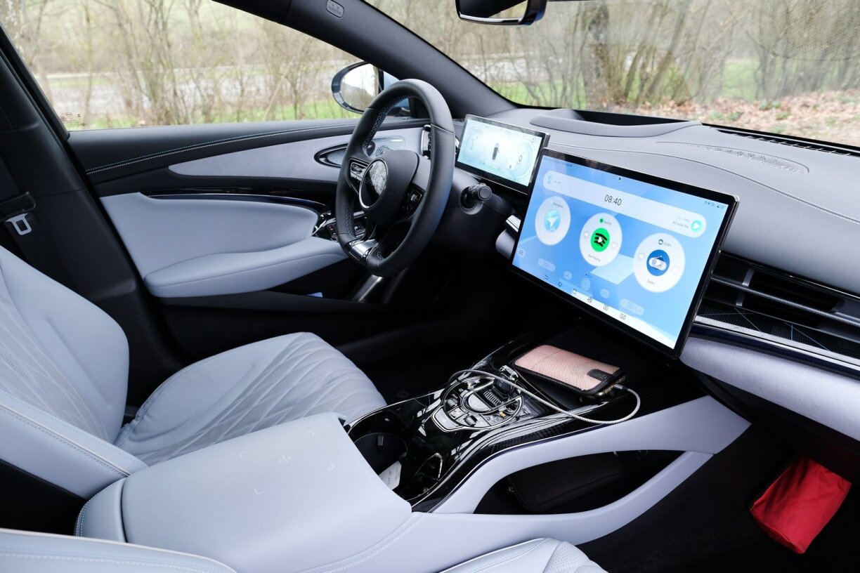 Besonnesch am hellbloe Lack wierkt déi ëmmerhin 4m80 laang Coupé-Limousine nach wéi vun engem anere Stär. Bannenan sinn d’BYD-Designer mat hirem Ocean-Design och e bësse géint de Stroum geschwommen: hellblot Lieder, glat a gesteppt, gesträiften Dekorbaguetten, hellgroen Nubuk, Konschtlieder mat faarwegen Néit – dat kléngt no wëllem Mix, gesäit awer richteg gutt aus. A Finitioune kënne se och, alles huet sech gutt ugefillt an näischt huet gerabbelt.