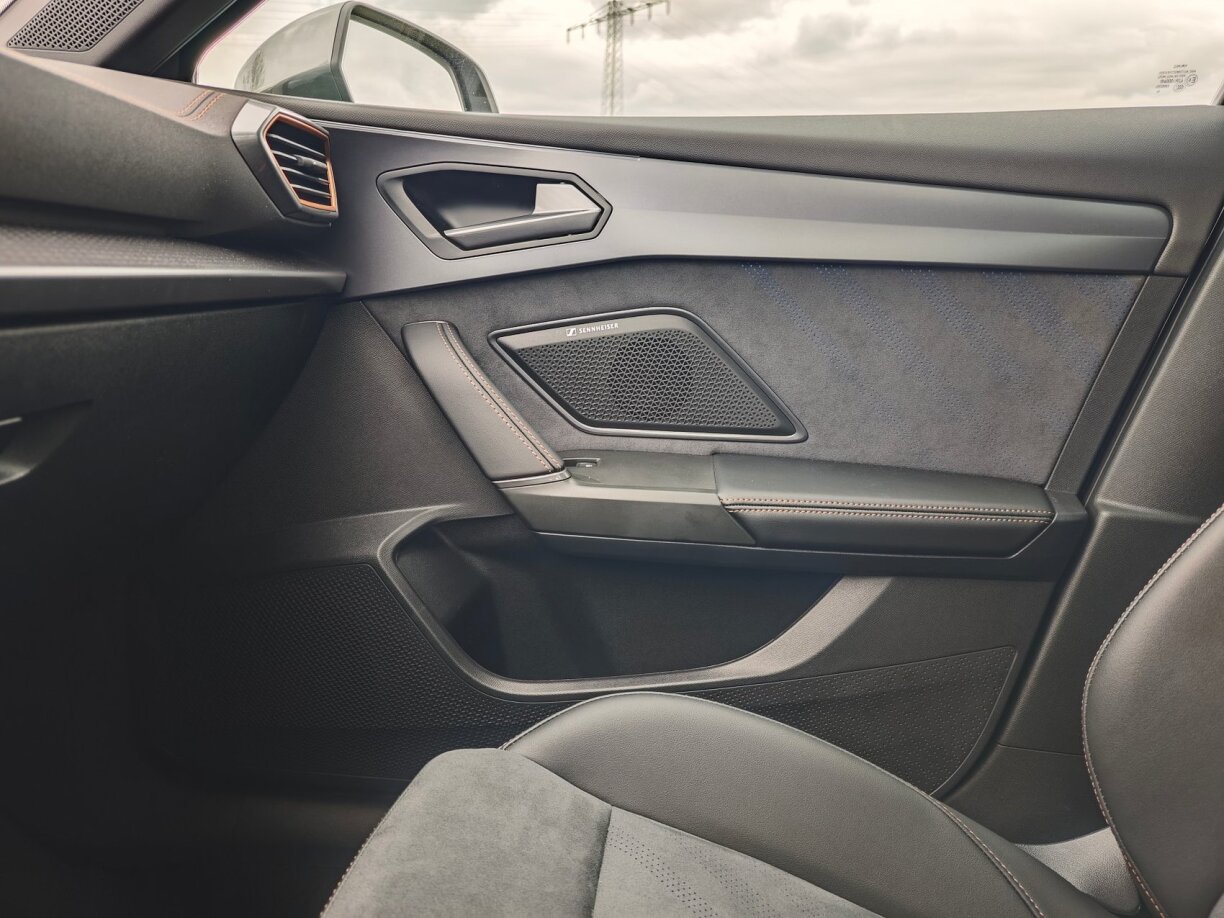 Wien en dynameschen Auto sicht, dee seng Muskele spille léisst, deen ass hei op der richteger Adress. Well “dynamesch” ass dat mannst, wat een iwwert de Look behaapte kann. De markante Cupra-Grill mat Koffer-faarwegen Elementer dierf natierlech net feelen, genee esou wéineg wéi d’LED-Phare mat der Liichtsignatur. D’Form vum Dräieck, déi jo schonn am Markelogo eng Roll spillt, taucht ëmmer nees op an zitt sech wéi e roude Fuedem duerch den Auto.