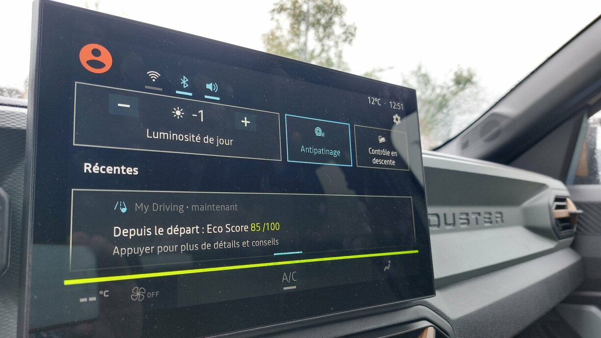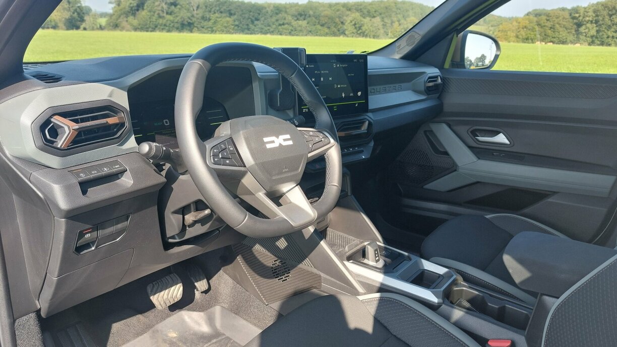 Och den 10 Zoll Ecran an den digitale Cockpit wëlle weisen, hei spillt elo eng aner Gei. Och am neien Dacia gëtt elo um Ecran getouched, an dee verbessert dech permanent mat dominante Piipstéin bei Vitesse oder Spuer-Infraktiounen.