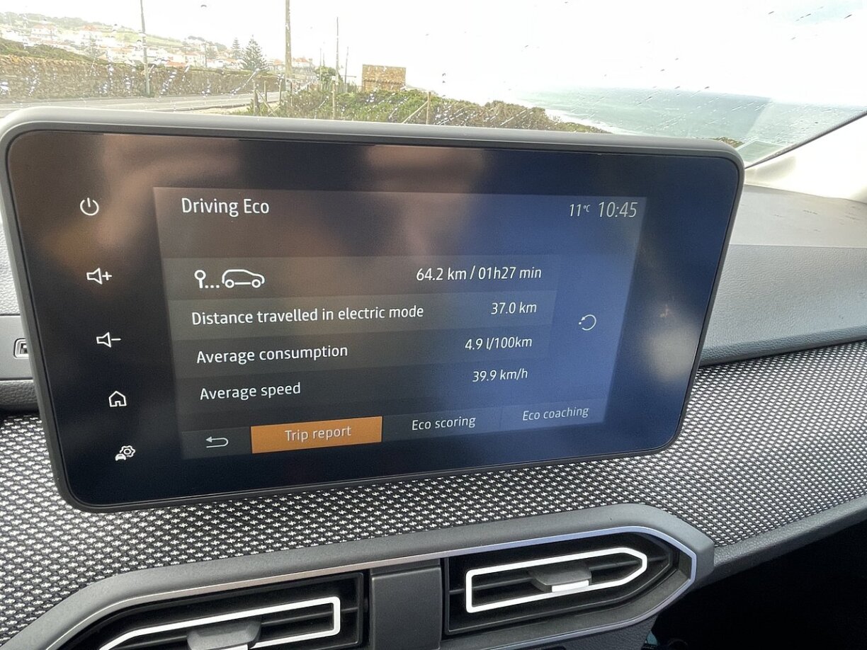Erstaunlech frësch a sprëtzeg muss ech soen. Den Jogger kënnt gutt aus de Féiss a reagéiert spontan, wann een d’Pedall bis duerchdréckt. Besonnesch am Stadverkéier mat senge roude Luuchten ass et vu Virdeel fir reng elektresch Unzefueren, ier de Verbrenner da bäispréngt. Dat ass an deene meeschte Fäll éischter ze héiere wéi ze spieren. D’Ingenieure vun Dacia wëllen ausgerechent hunn, dass ee bis zu 80% vum Stadverkéier reng elektresch fuere kann. Iwwerpréiwe léisst sech dat bei esou enger Präsentatioun awer net. Eisen Testparcours huet eis ronderëm Lissabon gefouert a war e Mix aus Autobunn, hiwwelege Landstroossen a Stadverkéier. Um Enn vum Test huet mer de Bordcomputer e Verbrauch vu 4,9 Liter ugewisen.