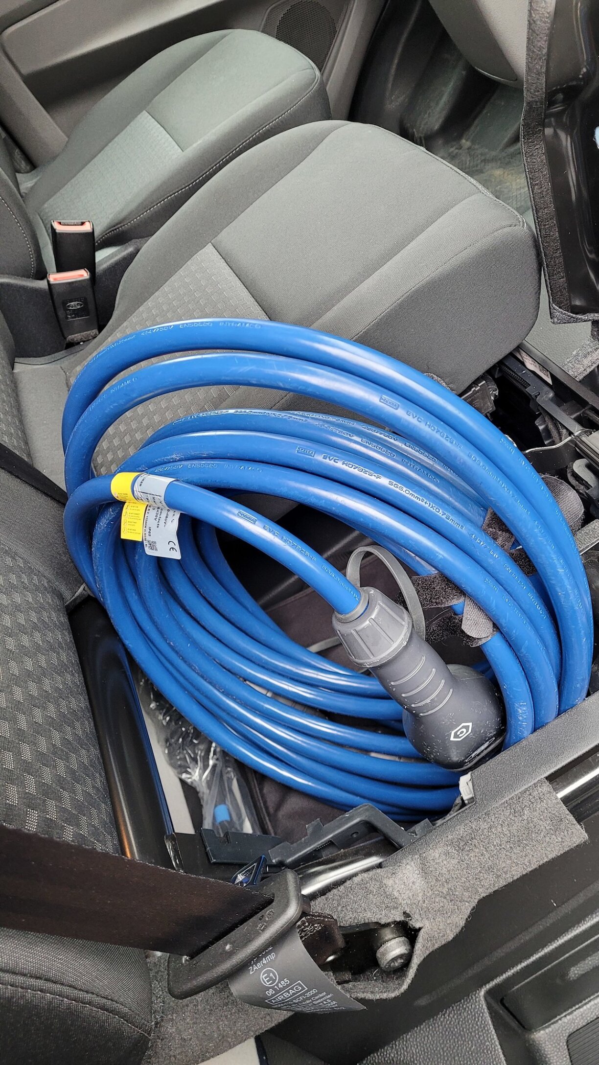 Mat maximal 11kW kann een un enger normaler Luedstatioun aspeisen, bis zu 115kw sinn un enger Schnell-Luedstatioun méiglech. Den 68 kWh-Akku kann een esou bannent 35 Minutte vu 15 op 80 Prozent lueden. De Lued-Uschloss ass iwwregens vir an der Kalander vum E-Transit, wat ee bedenke sollt, wann ee bei eng Luedstatioun fiert, soss kann et mol enk gi mat der Längt vum Luedkabel.