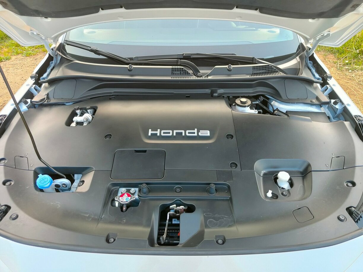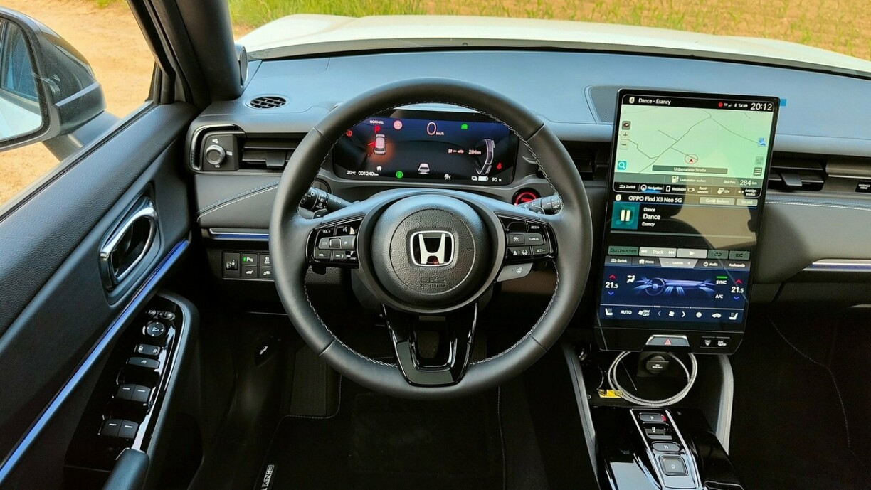 Rou a Gedold behale muss een och beim Oplueden; maximal 78 kW kann den e:Ny1 via CCS zéien – dat hunn antëscht vill aner Marke wäit iwwertraff. Op der anerer Säit packt sech de Verbrauch; siele sinn et iwwer 19 kW-Stonnen. Och positiv ze ernimmen ass d’Fuerverhalen. Honda huet hirem Elektro-SUV en nawell komfortabelt Fuerwierk spendéiert ouni d’Fuergefill syntheetesch ginn ze loossen. D’Steierung mellt gutt zeréck an d’Stroosselag bleift quasi ëmmer neutral. Genervt hu leider och bei Honda d’Assistenzsystemer, déi deels net konnten ausgeschalt ginn esou wéi déi immens oniwwersiichtlech a schlecht erkläerte Menüe vum Infotainment. Iwwert déi 14 Deeg stoung den e:Ny1 och nach stänneg am Clinch mat mengem Smartphone, huet ëmmer nees d’Kopplung vergiess an den Android Auto mol zougelooss, mol net. Och dat klappt antëscht bei anere Marke vill besser.