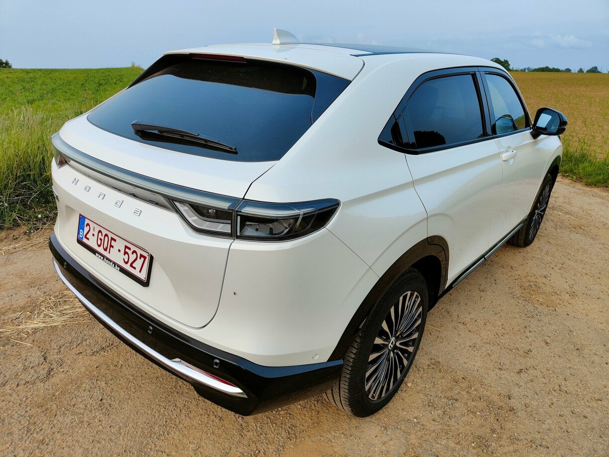 Och wann den e:Ny1 staark dem HR-V gläicht, hien steet op enger anerer Plattform. A kënnt mat engem nidderege Greenhouse a staark geneigter Heckfenster och e bësse méi am Stil vun engem SUV-Coupé dohier – e Segment wou sech Honda méi Succès erwaart wéi mam klengen “e”. Géingt den Design ass näischt ze soen, den e:Ny1 ass gefälleg geroden a mat knapp 4m40 och net ze grouss.