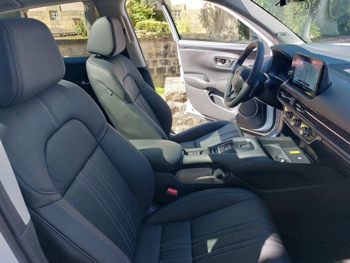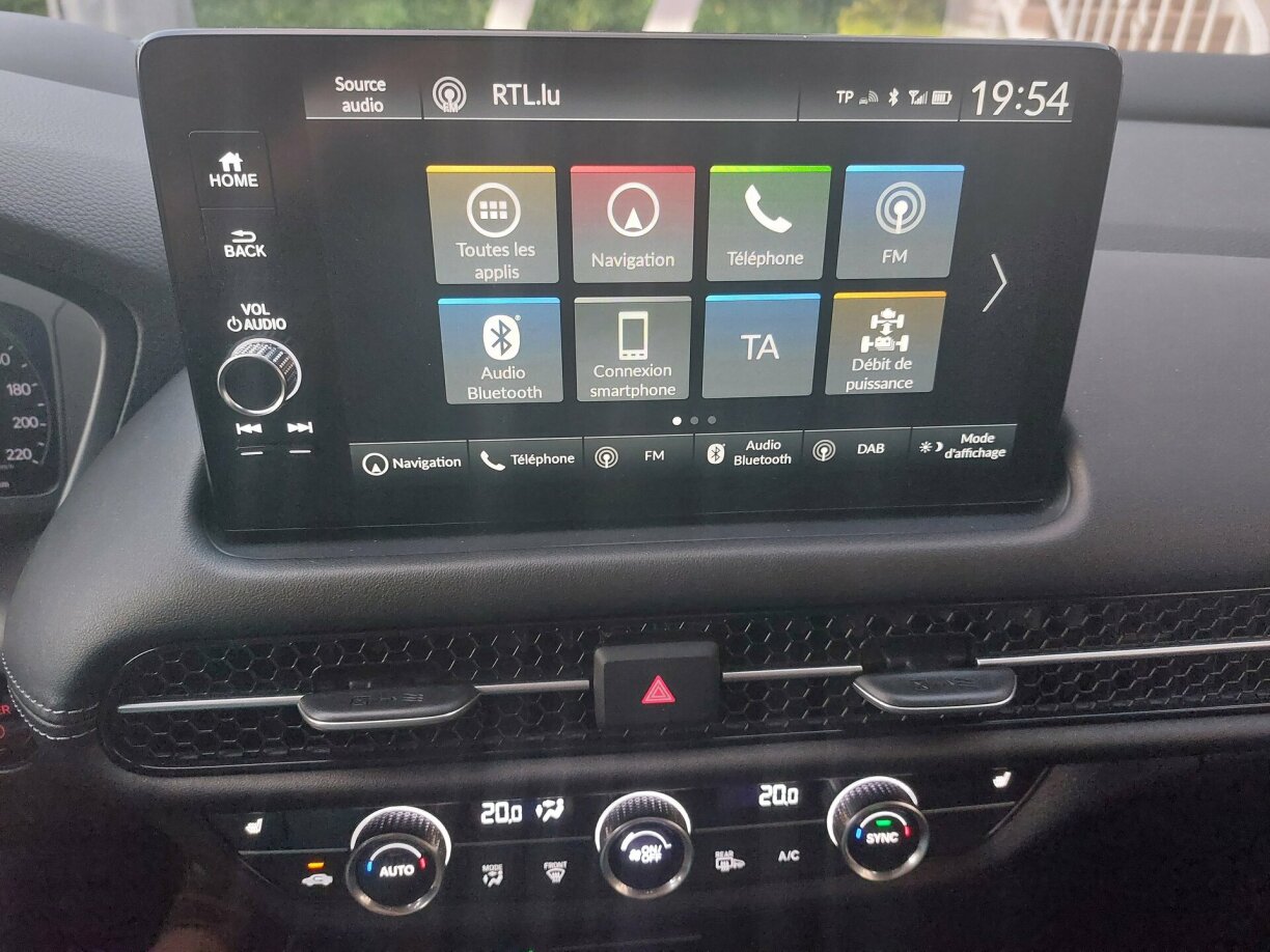 Och hei geet Honda keng Experimenter an. Alles läit do wou et soll, ass gutt verschafft an de Soft-Touch gefält. Dat gëllt och fir d’Sëtzgarnitur. Plaz vir an hanne ganz generéis. 2m66 Radstand, dat ass e Wuert. Net ze vill Touchscreen, mee dee Screen kéint méi grouss ausfalen, an d’Grafik vum Navi ass net méi up to date. Mee Smartphone, Apple CarPlay an Android Auto geet.