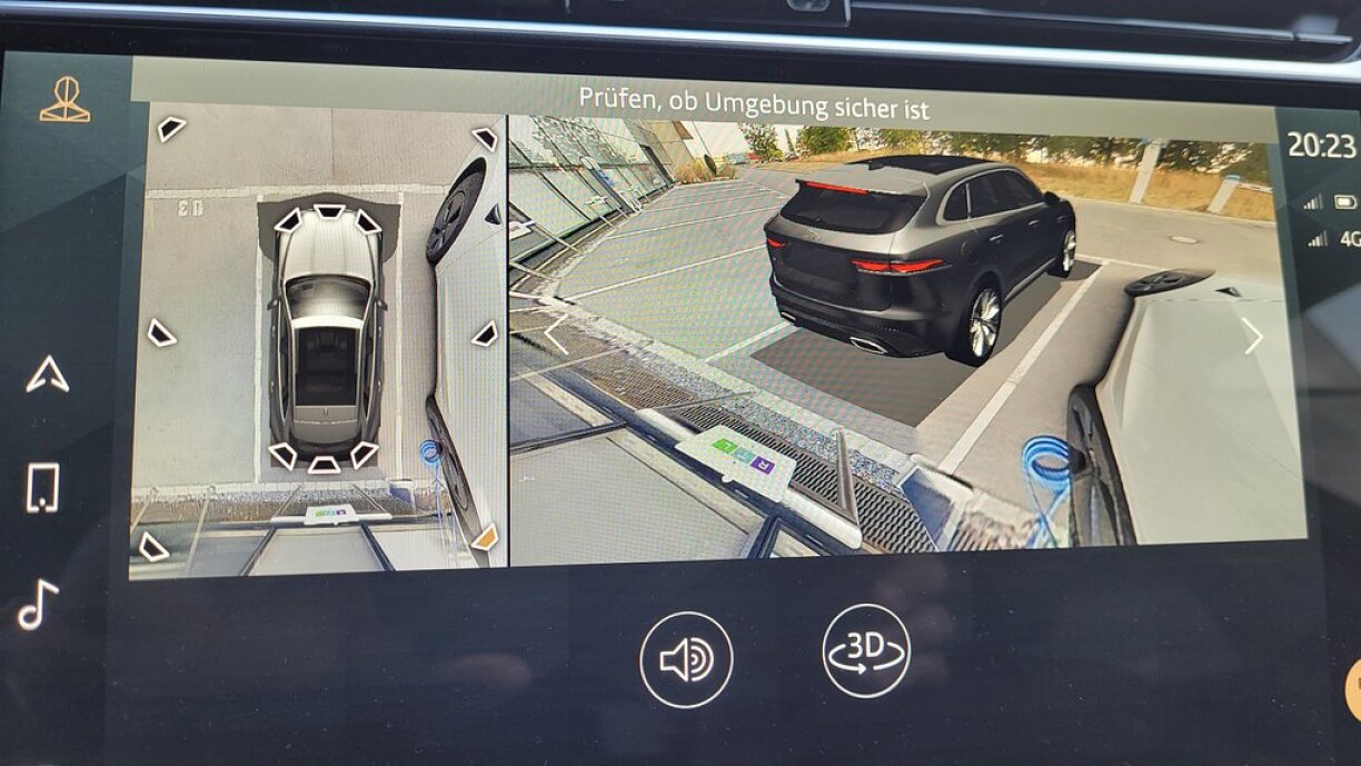 D’3D-Kamera hëlleft dann och beim aparken, an et kann een am 360°-Modus ronderëm den Auto kucken, ob een dann och sécher an der Parkplaz steet an ee kee Potto oder Änleches iwwersinn huet. D’Iwwersiicht am Auto ass nämlech net grad extra gutt, virun allem no hannen. Do ass sou e Kamerasystem scho praktesch.