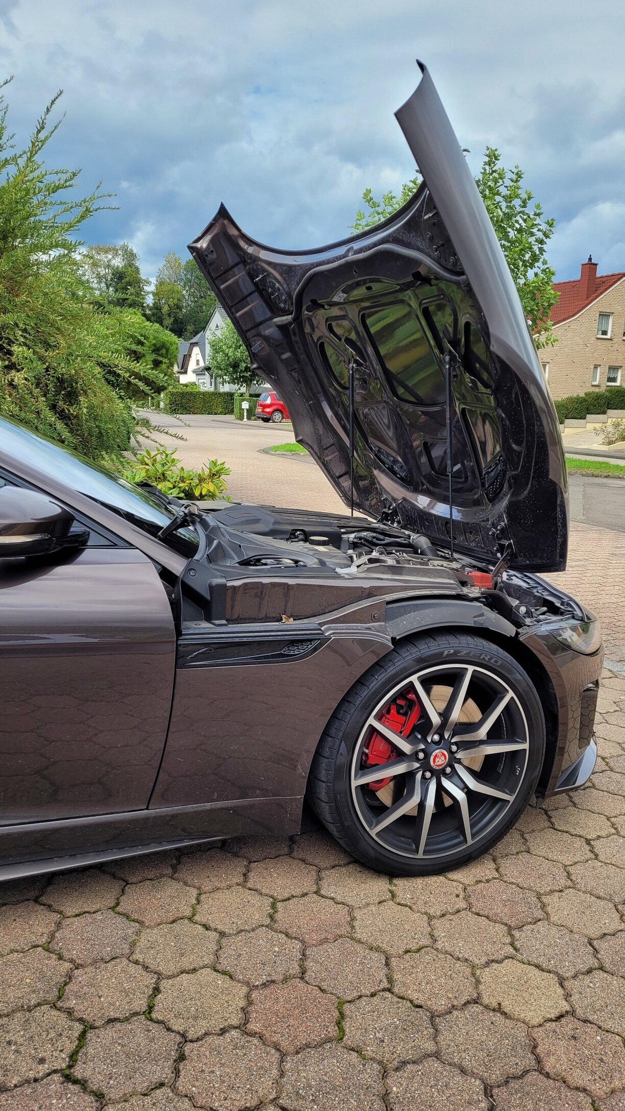 Den F-Type ass keng Neientwécklung ma e Facelift. Déi markantsten Ännerung zum Virgänger gesäit een am beschten un der Front. De Grill ass quasi identesch, ma besonnesch de Luuchtendesign huet geännert. Déi si vir nach méi schmuel ginn, a verbreede scho bal e liichten Aston-Martin-Look. Och um Heck sinn d’Luuchten en Tick méi schlank ginn. Fir de Recht behale mer de wonnerschéinen Design , deen och am Alldag ëmmer nees dofir suergt, dass Leit sech nom Auto ëmdréinen… ma net am negative Sënn. Spektakulär gëtt et, wann een de Capot opmécht, deen ass éischtens net just riseg, ma zweetens klappt deen och nach no vir op, wat éischter en ongewinnte Bild ass.