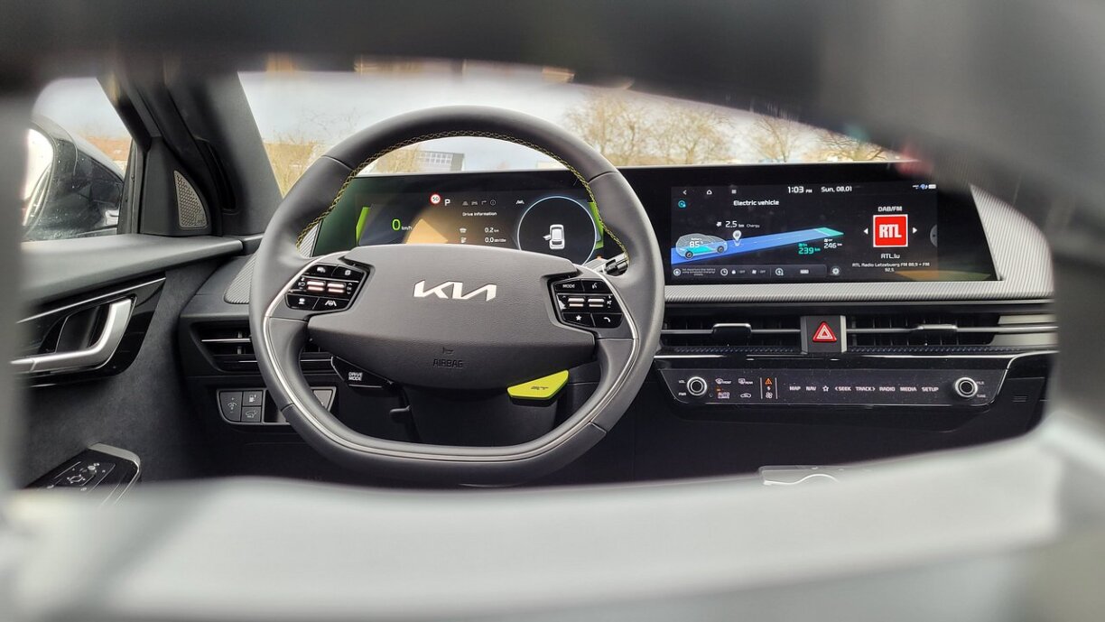 Fir déi, déi et nach net matkritt hunn... de Kia EV6 ass en Elektroauto, méi genee e Crossover-SUV. Dass esou ee groussen Auto och sportlech Geene kann hunn, huet KIA mat der GT-Versioun bewisen. Ugefaange mat der Motoriséierung. Am klengste Modell huet den EV6 229 PS. Am GT hu mer awer net manner wéi 585 PS a 740NM Dréimoment. De Sprint vun 0 op 100 geschitt hei an 3,5 Sekonnen. Dat geet duer fir deen een oder anere Sportswon ganz al ausgesinn ze loossen. Via e grellgiele Knäppchen um Steierrad, wou “GT” drop steet, kann een an de Modus mat maximaler Leeschtung switchen. An ech kann iech soen, sou eng Beschleunegung an esou engem groussen Auto fillt sech impressionant un!
