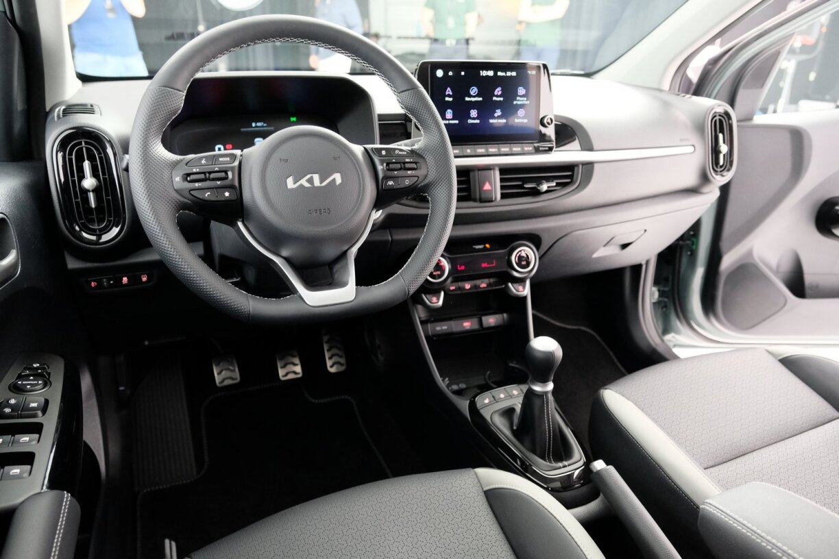 Fir den Interieur huet Kia sech bei modernen Naturtéin inspiréiert: schwaarz, gréng oder brong huet d’Palett ze bidden, applizéiert ginn dës op de Sëtzer, Dieren a Lüftungsdüsen. A punkto Infotainment gouf och moderniséiert .Serieméisseg fueren een 8-Zoll-Touchscreen an digital Instrumenter mat, Apple Car Play an Android Auto si scho bal selbstverständlech, ausserdeem ass den neie Picanto online ënnerwee, sief et fir Navi oder Software Updates.