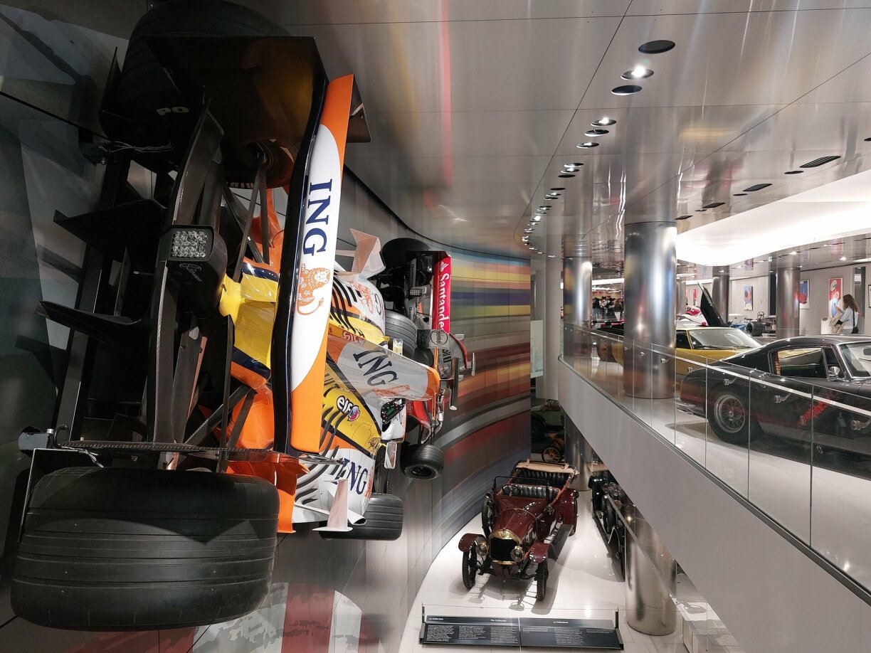 “Les plafonds, on a l’impression que cela fait comme un circuit avec des courbes. Couleurs sur les murs et avec des voitures F1 sur les murs pour donner l’impression du dynamisme, parce que les voitures sont statiques. Le cinéographe voulait montrer la vitesse et voulait aussi présenter la mode et le cinéma. On voit sur des écrans géants des morceaux de film de gloire dont ces voitures jouaient un rôle à l’époque. Vous avez aussi des podiums sur lesquelles sont mis certaines belles élégantes qui remémorent aussi les concours d’élégance de l’époque.”