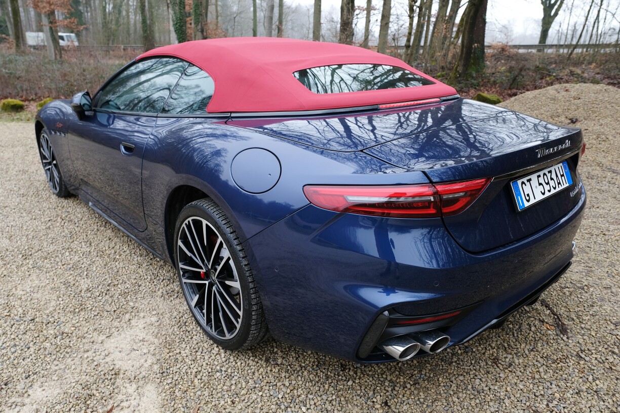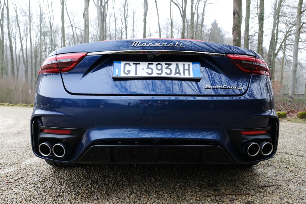 Wann e Maserati eppes huet, dann ee Wiedererkennungswäert: déi typesch grouss oval Kalander mam Dräizack, déi bombéiert Schutzblecher, déi ronn Formen, déi sech bis no hannen zéien – dat huet eppes. Och de Cabrio, an eiser Versioun Trofeo am blu Modena mat Granata Daach, weist den Italieener hir Léift zur Ästhetik. Hei si véier chroméiert Auspuffréier net nëmmen Deko, mee si hunn nach hir Funktioun.