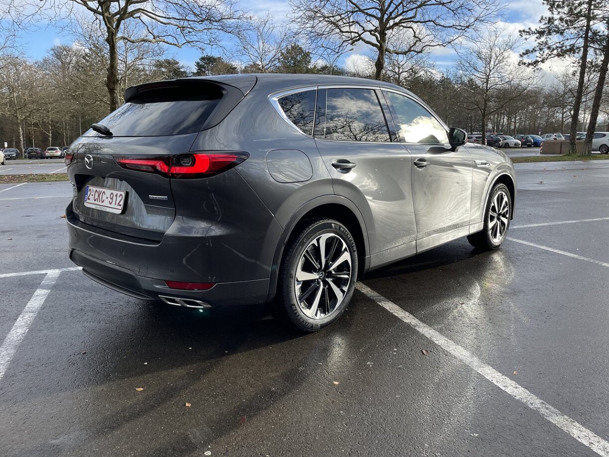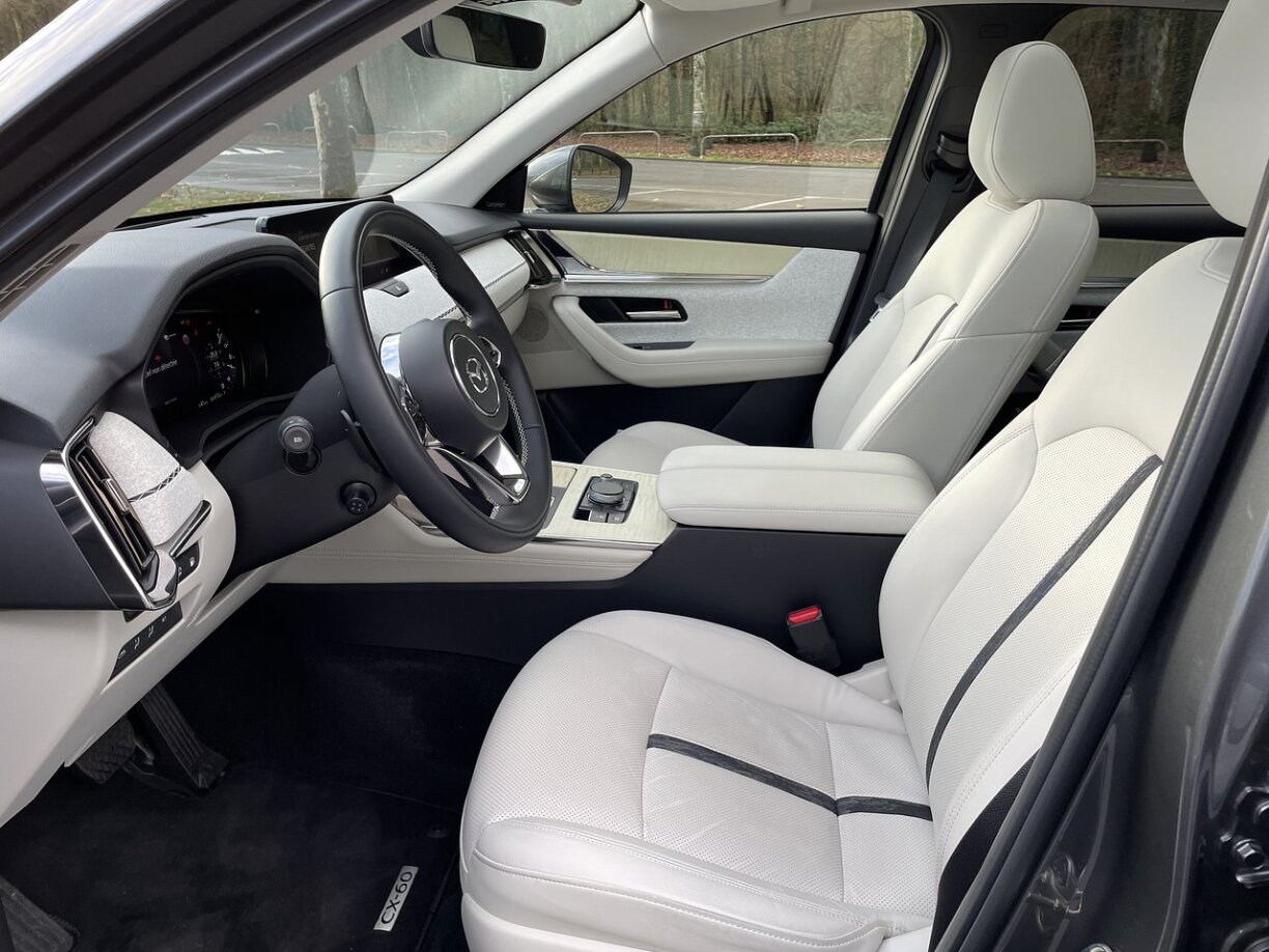 Mam CX-60 feiert Mazda gläichzäiteg d’Premiere vum éischten eegene Plugin-Hybrid. En 2,5 Liter 4-Zylinder (191 PS) an en 129 kW Elektromotor liwweren als „e-Skyactiv PHEV“ eng Systemleeschtung vun 327 PS (241 kW), Allrad-Undriff ass Serie. An der Theorie gi 5,8 Sekonnen bis Tempo 100 duer, reng elektresch sinn 140 km/h méiglech. Eisem Testauto misst een allerdéngs fléiwen: beim Kickdown huet d’Boîte sech Zäit gelooss, ier d’Leeschtung un de Rieder ukomm ass, an och de Motor huet net sportlech mee ugestrengt geklonge. Dat kënnen anerer besser.