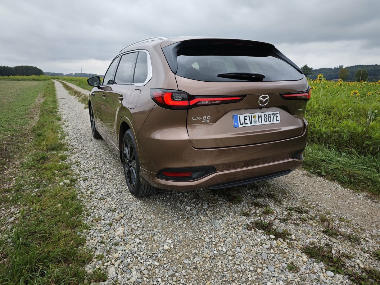 Den CX-80 setzt op Understatement: gefälleg, onopgereegt an ouni Iwwerraschungen, déi engem sauer opstousse kéinten. Wann ee riicht virdru steet, kéint een CX-80 a 60 scho mol verwiesselen. Vun der Säit gëtt dann awer kloer, dass den CX-80 eng Kategorie driwwer doheem ass.