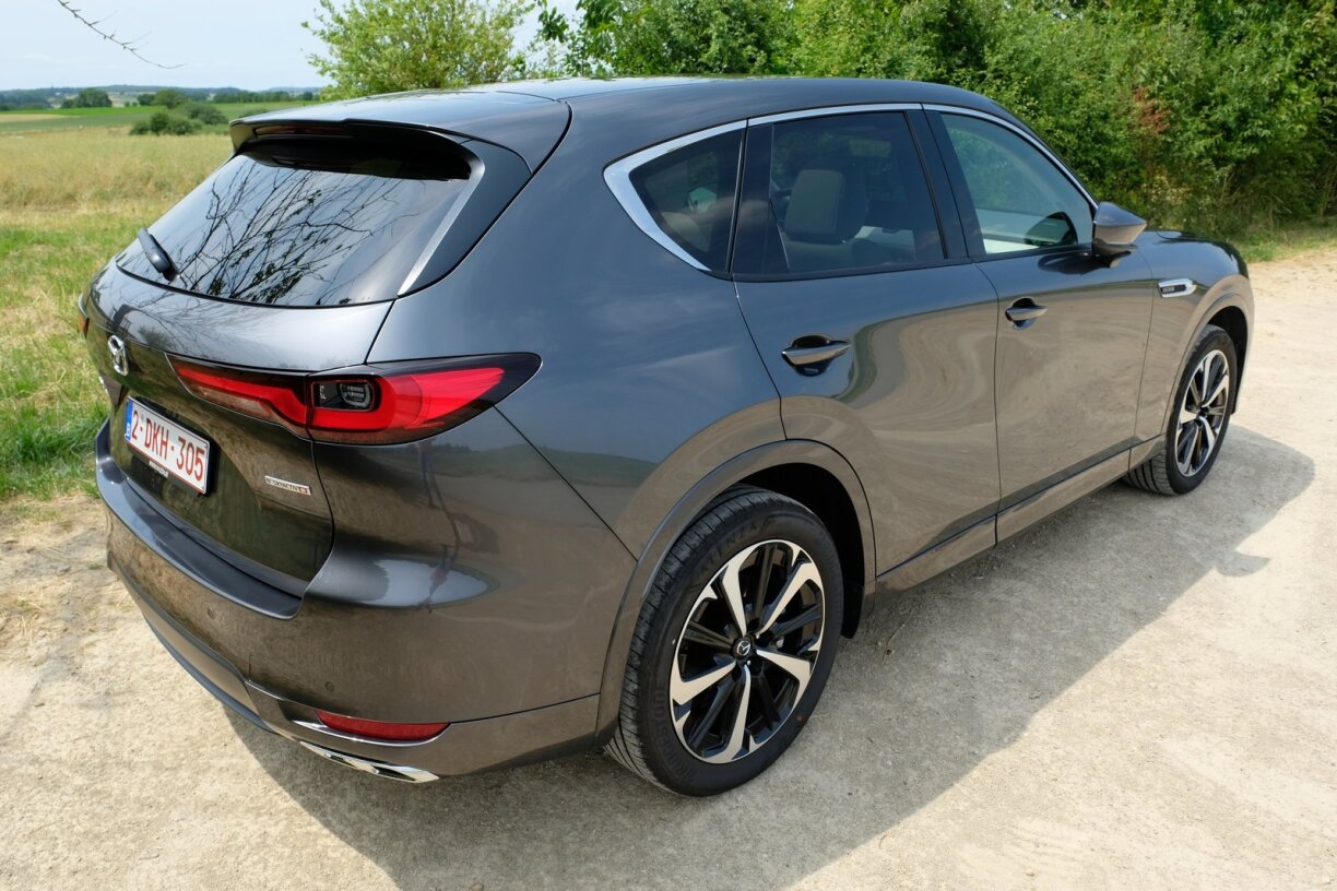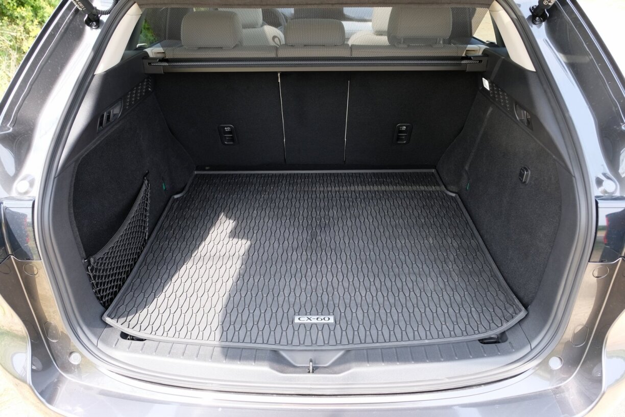 Mat iwwer 4m70 iwwertrëfft den CX-60 de klenge Brudder CX-5 nach emol ëm 17 cm an der Längt, och an der Breet kënnt nach emol e gudde Krack derbäi. Esou ziilt de grousse Mazda-SUV a Richtung Volvo XC60 a Co. Designméisseg kann e jiddefalls mol mathalen, do hu se bei Mazda jo schonn méi laang eng gutt Hand. Mee och wat de Raum bannenan ugeet, kann een den CX-60 als duerchaus lëfteg aklasséieren. Kapp a Beefräiheet ginn an d’Rei, 570 Liter Mall ass och een uerdentleche Wäert. Esouvill wéi de Banneraum profitéiert, ass de grousse Gabarit beim Fueren awer net ëmmer vu Virdeel. Besonnesch déi zimmlech breet a bulleg Nues ass bei enke Garagen een Challenge. Zum Gléck hunn awer déi wierklech performant Kamerasystemer vum Testauto e gudden Déngscht geleescht.