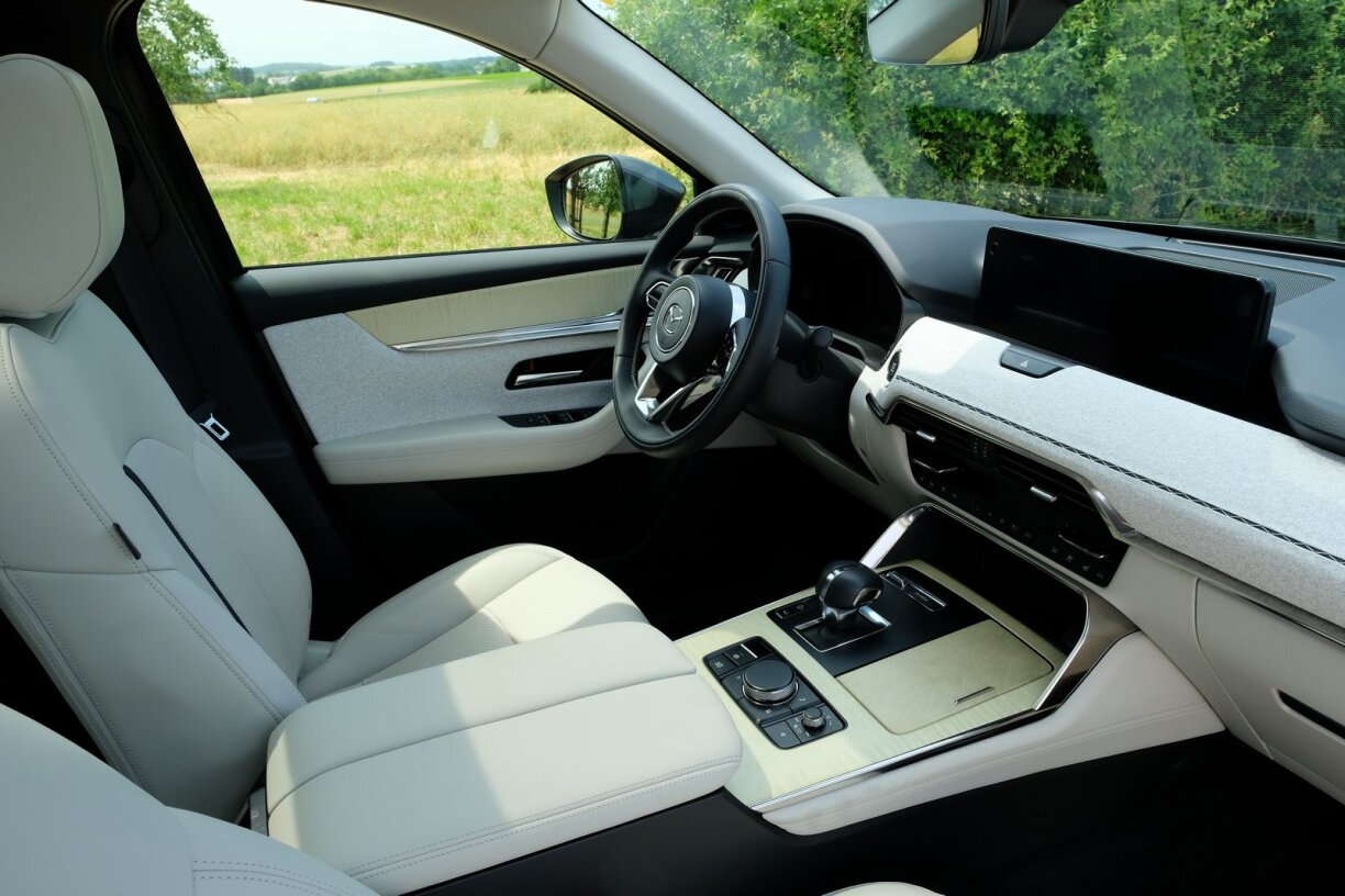 Dat kann een duerchaus soen. Wat zum Beispill d’Veraarbechtung bannenan ugeet, huet Mazda gutt geschafft. Mëllt Lieder, ee gewote mee héichwäertege Materialmix, gestach schaarf Bildschiermer a virun allem nach Knäppercher fir déi wichteg Funktiounen – mir huet dat gutt gefall. Den Haapt-Entréesticket an d’Top-Kategorie vun den SUV stouch bei eisem Test-Auto awer ënnert dem Capot.