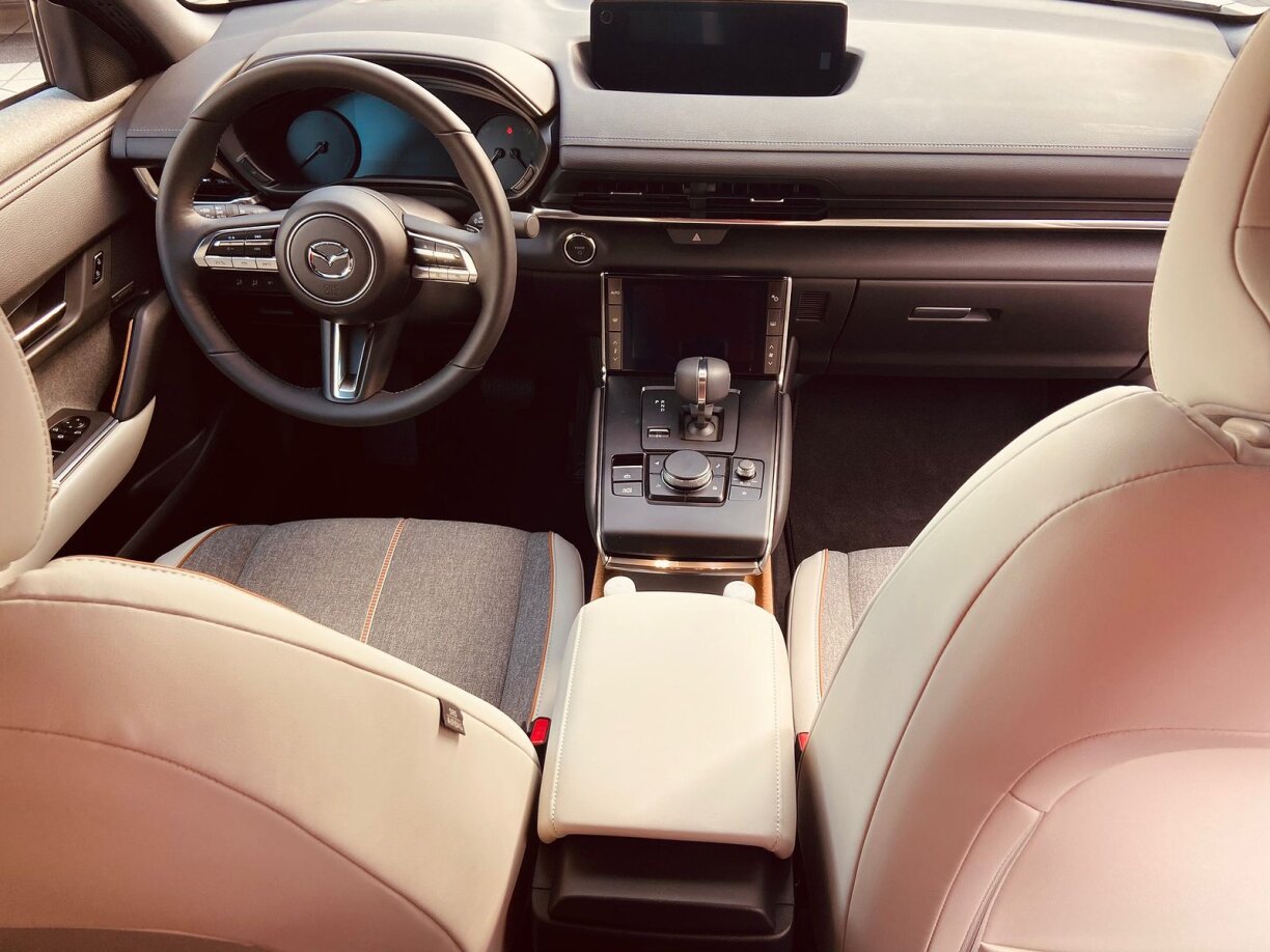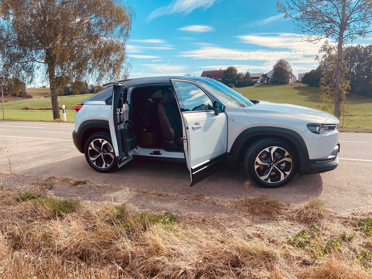 Ech si ronn 300 Kilometer mam Mazda MX30 e-Skyactiv R-EV gefuer an do huet alles funktionéiert. Du hues 3 verschidde Modien zu Verfügung, wous de kanns wielen, wéini den Akku iwwer de Generator soll geluede ginn. Am Prinzip denken ech fiert een am “Normal” Modus. Do spréngt de Motor un, wanns de zum Beispill ee Kickdown mat der Gaspedall méchs. Wann dee Motor uspréngt, muss ech soen, geet engem dat Gesouers dach e bëssen op d’Ouer. Soss op der Strooss ass awer näischt géint den Auto ze soen. 170 Päerd, bei ronn 1.700 Kilo, ginn duer fir vun 0 op 100 eppes méi wéi 9 Sekonnen ze brauchen. Schluss ass allerdéngs schonns, bei enger maximaler Vitesse vun 144 Kilometer an der Stonn. Wann d’Batterie eng Kéier sollt praktesch platt sinn, da kann een déi mat maximal 36 kW Gläichstroum un enger Luedstatioun a 25 Minutten vun 20 op 80 Prozent lueden. Mat 11kW doheem un der Wallbox, vun 0 op 100 Prozent a 90 Minutten.